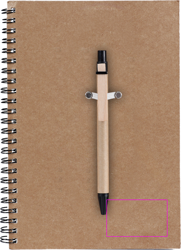 A5 Schreibblock aus Recyclingkarton und -papier mit 120 linierten Seiten und einem blauschreibenden Kugelschreiber aus Recyclingkarton. Ihre Werbung drucken wir auf den Umschlag.