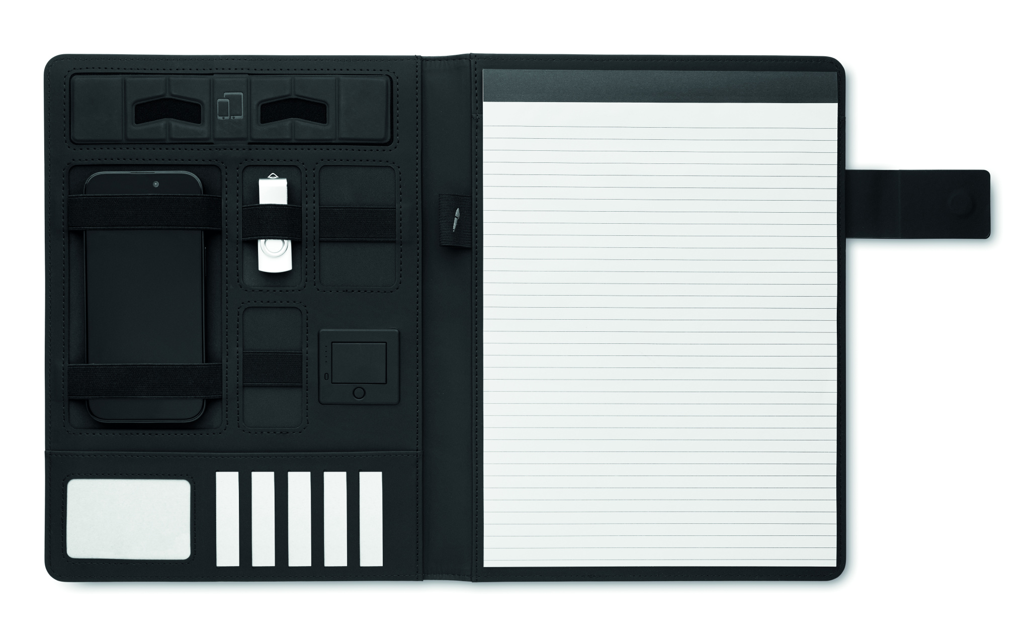 DIN A4 Konferenzmappe mit Cover aus Leinen und PU. Notizblock mit 20 Blatt liniertem Papier, diversen Innenfächern, Stiftschlaufe, 5000 mAh Powerbank und 15W magnetisches kabelloses Ladegerät. Magnetischer Verschluss.