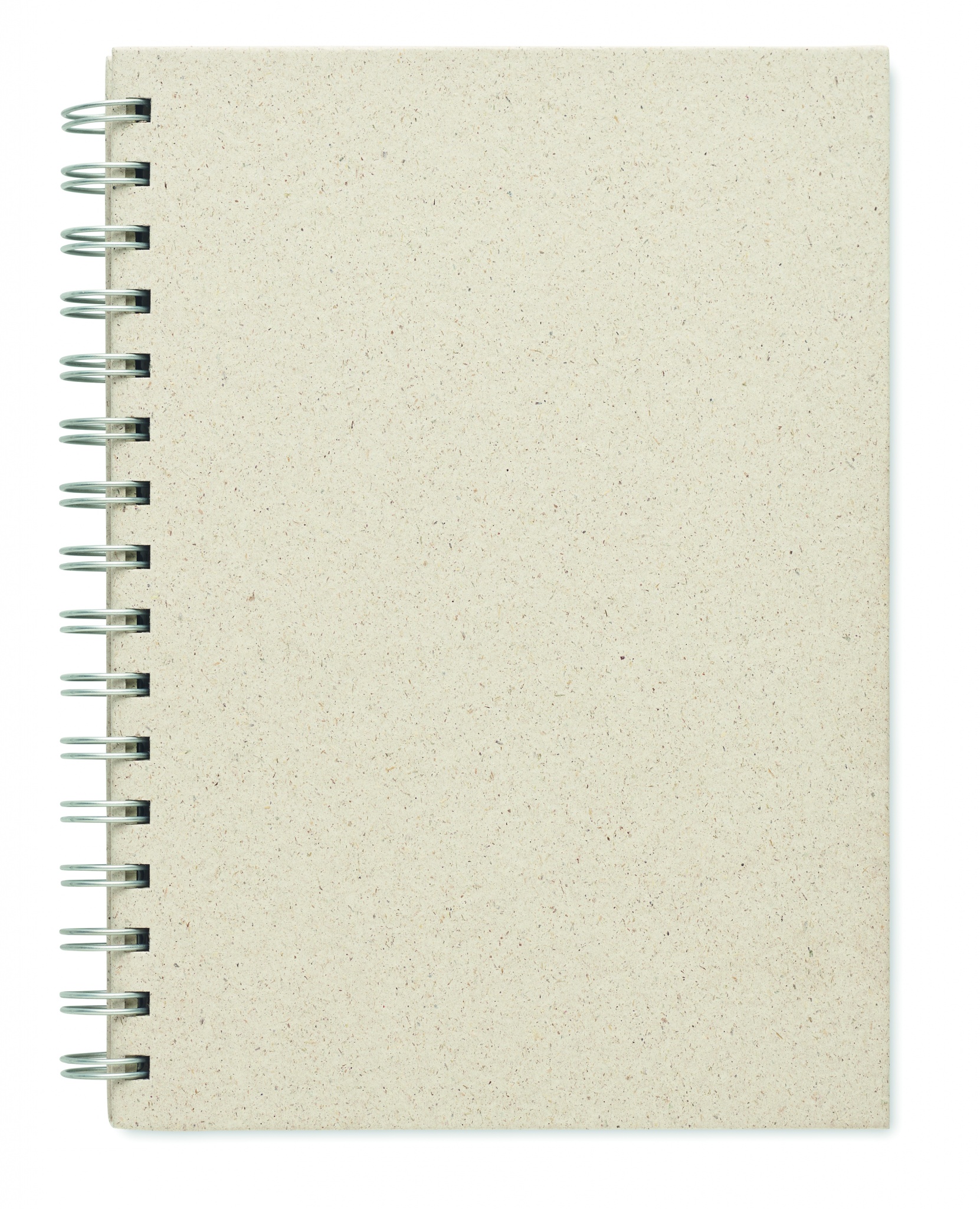 DIN A5 Notizbuch mit Hard Cover aus Graspapier. 80 Blatt (160 Seiten) liniertes Graspapier (enthält 40% Grasfasern). 95g/m². Spiralbindung. Hergestellt in der EU.