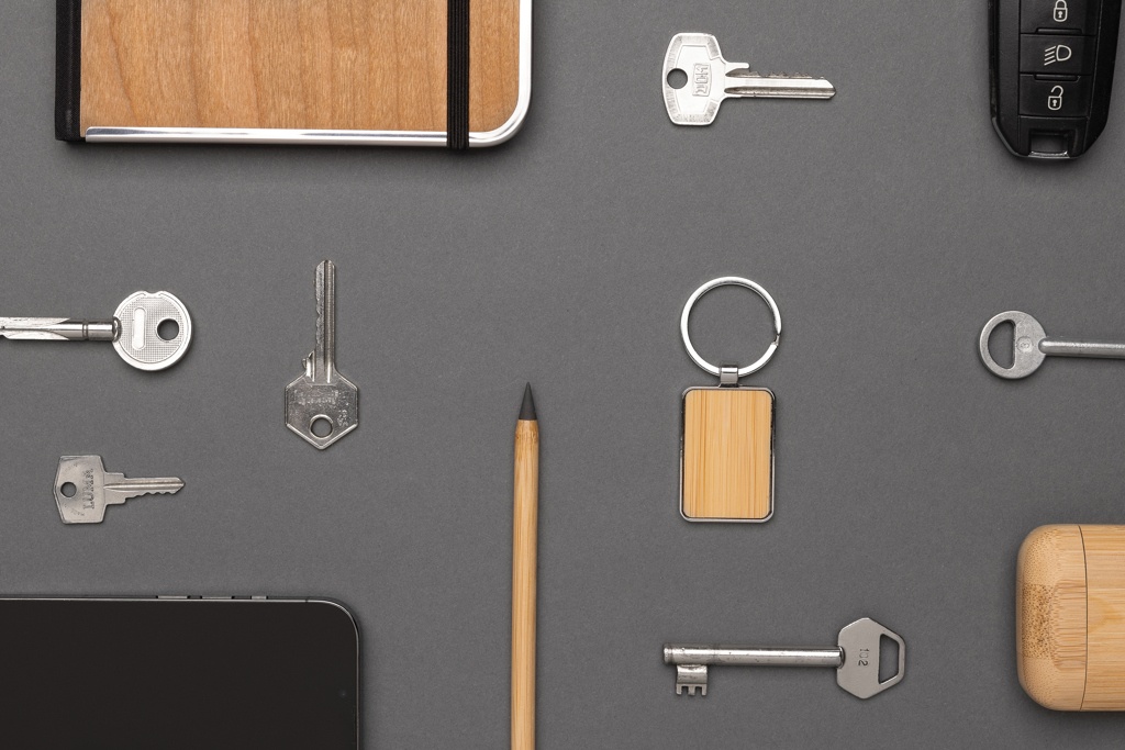 Produkte Elektronik Eckiger Schlüsselring aus RCS rec. Zinklegierung mit Bambus