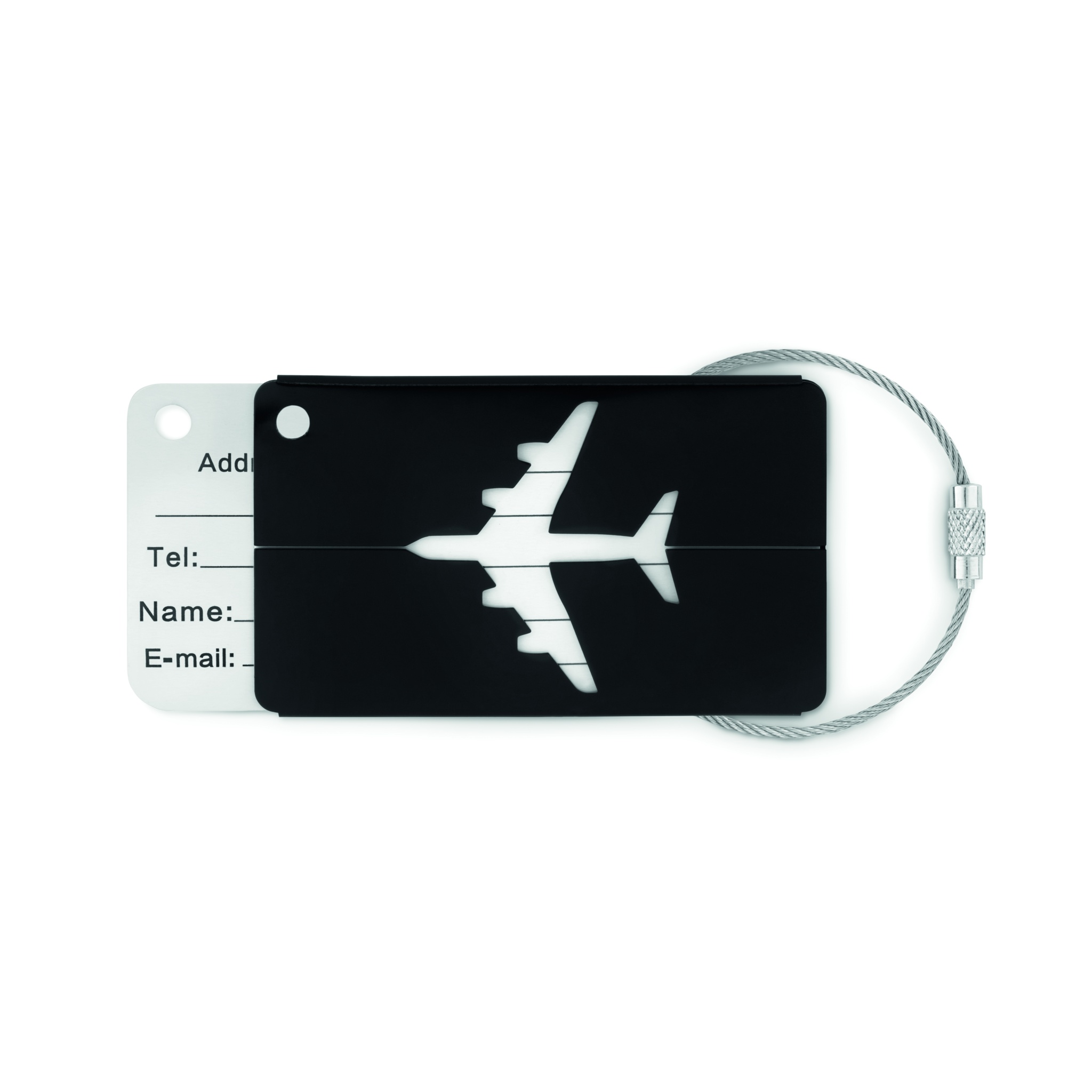Kofferanhänger aus Aluminium. Mit verstecktem Adressfeld. Motiv ''Flugzeug''.