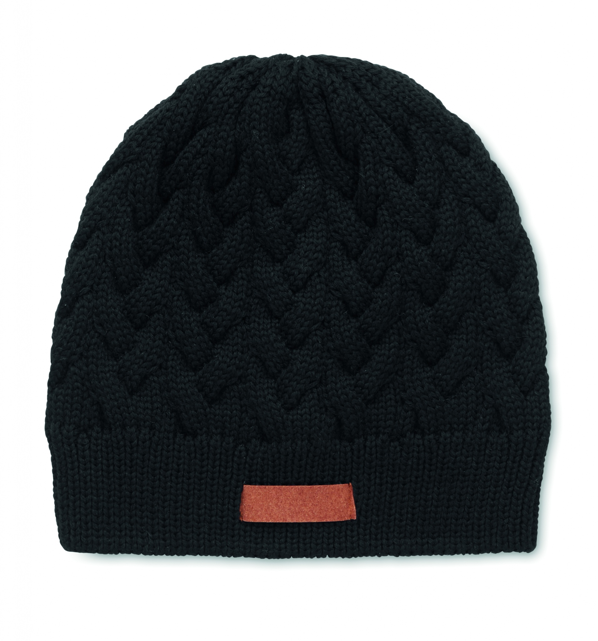 Mütze im Zopfstrickmuster aus RPET. Mit Label zur Werbeanbringung.