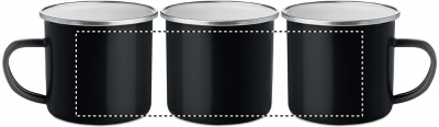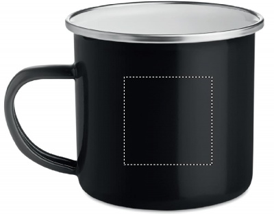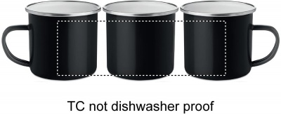 Emaillierter Metall-Becher im Vintage-Look. Füllmenge: 350 ml. Bitte beachten: Keine Drucktechnik ist spülmaschinengeeignet, auch Keramik-Transferdruck nicht.