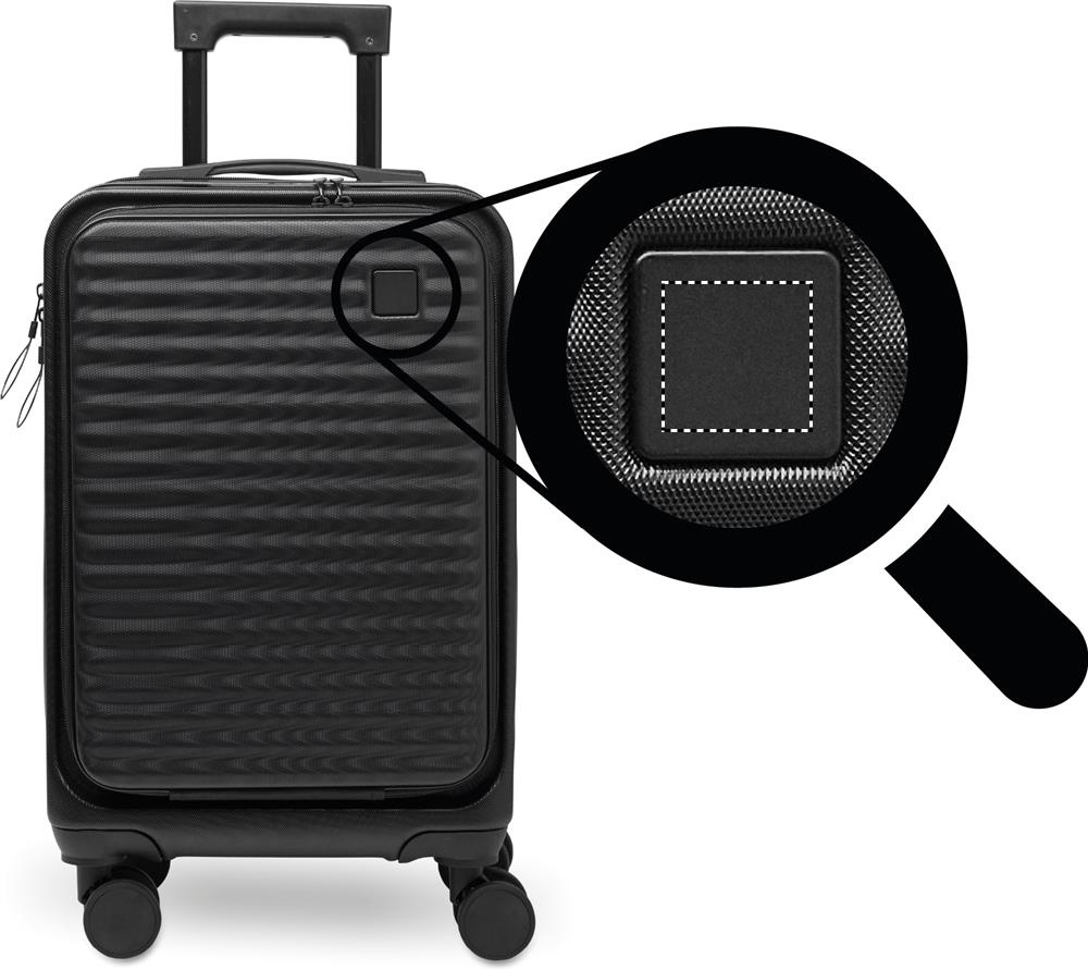 20 inch hard-shell trolley in ABS. 1 main compartment with inner compartment. Additional front zippered compartment for documents and padded 15'' laptop compartment. Includes a security lock (TSA). Rides on 4 wheels.