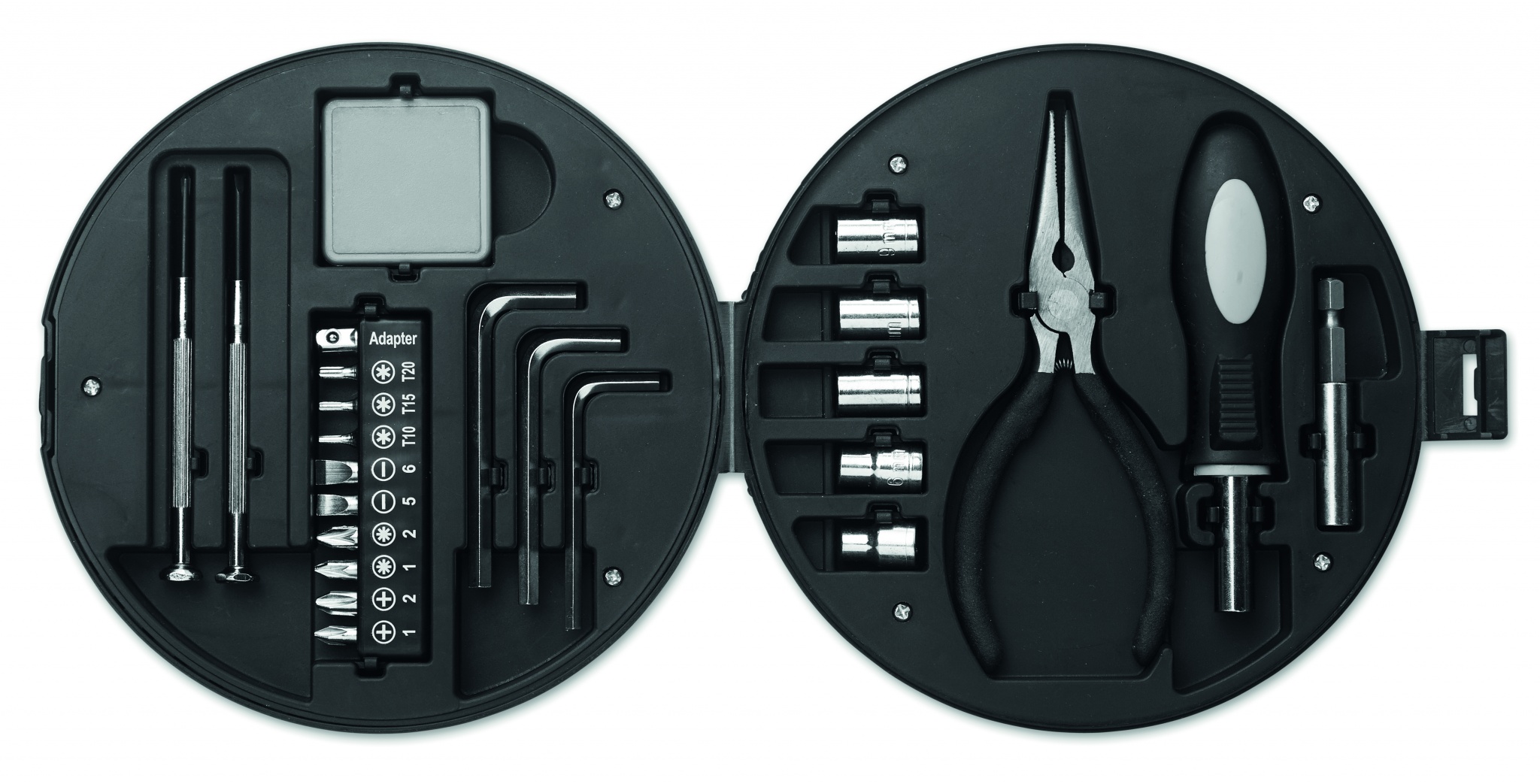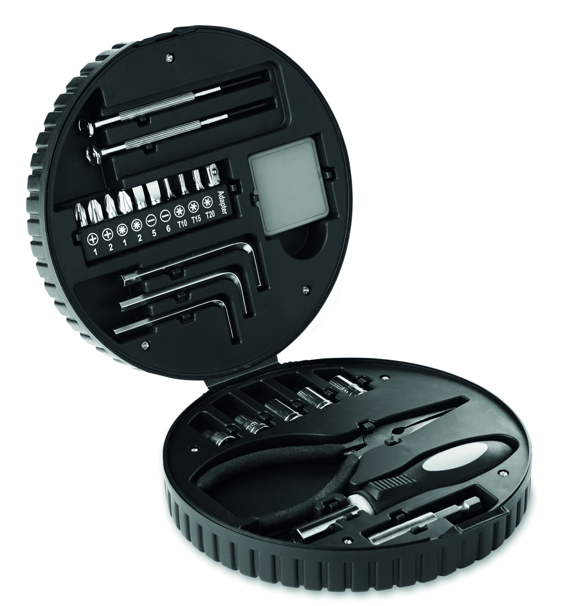 25 piece tool set in tyre shaped box including 1 extender, 1 socket screwdriver, 1 nose plier, 5 sockets, 3 hex keys, 10 bits set, 2 precision screwdrivers and 1 tape.
