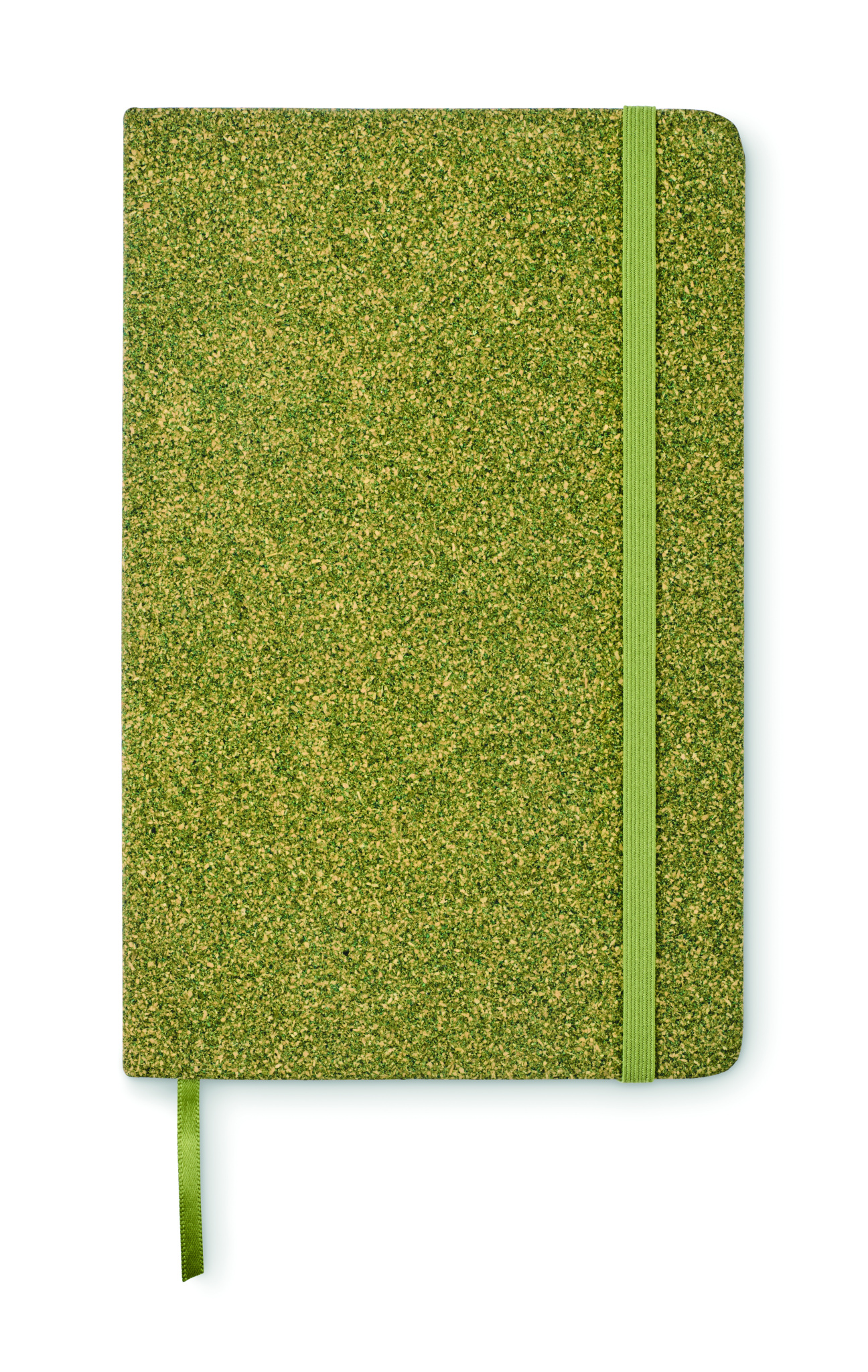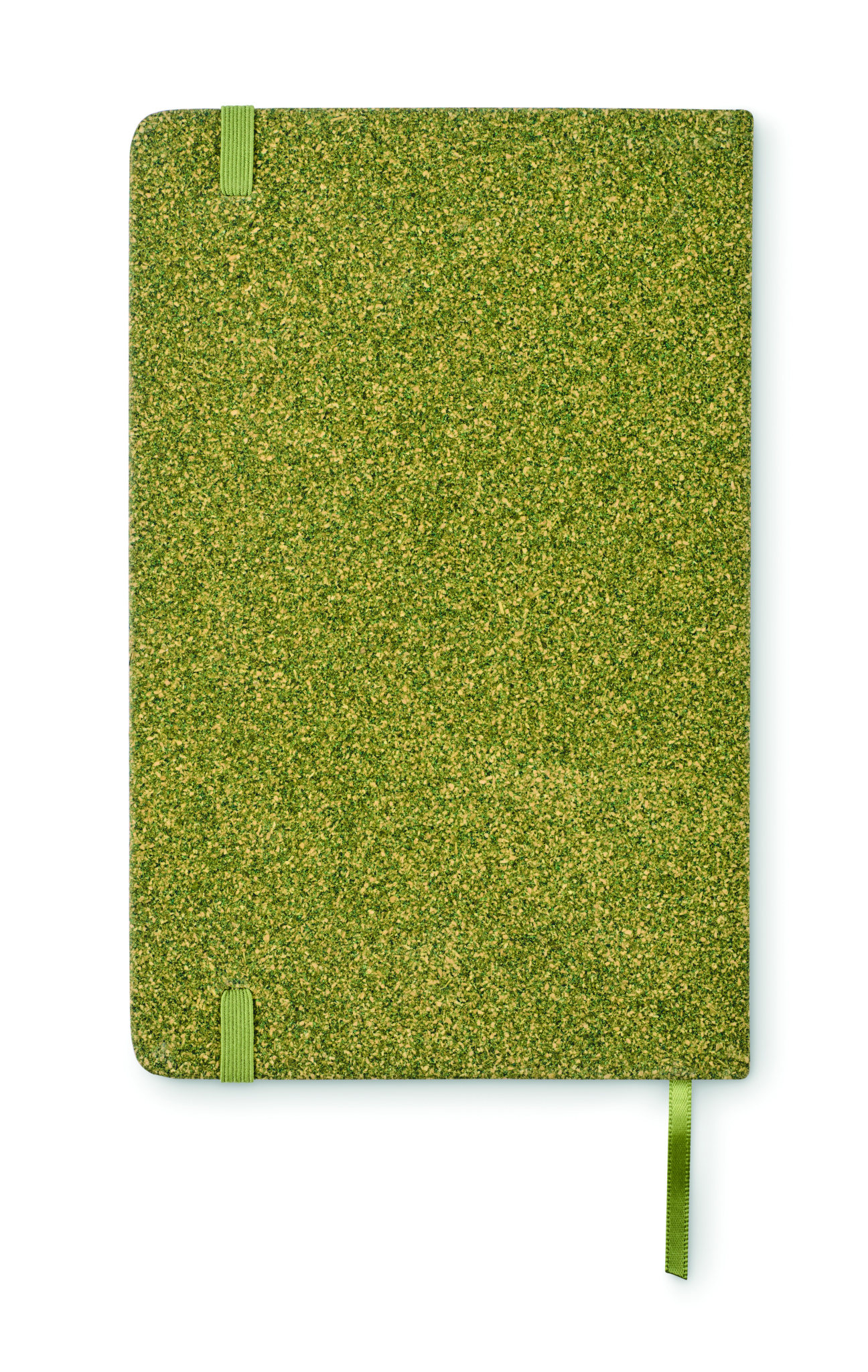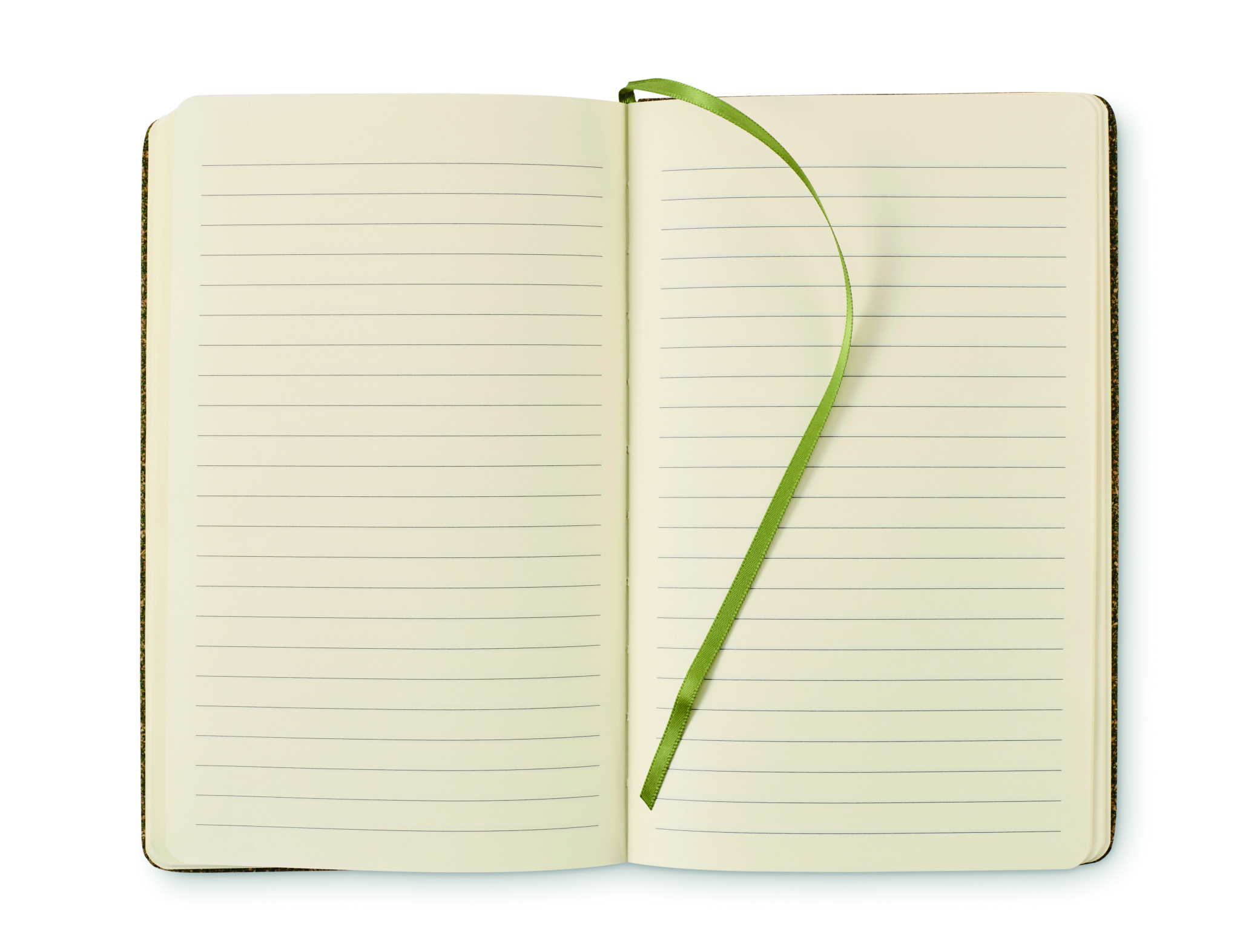 A5 notebook with hard cover made of 20% tea grounds, 30% cork and 50% polycotton cloth. Casebound.160 lined recycled paper pages (80 sheets/70gsm). Matching elastic closure strap and ribbon page-marker. FSC®-certified | FSC MIX CREDIT, N7.1, FSC-C213206