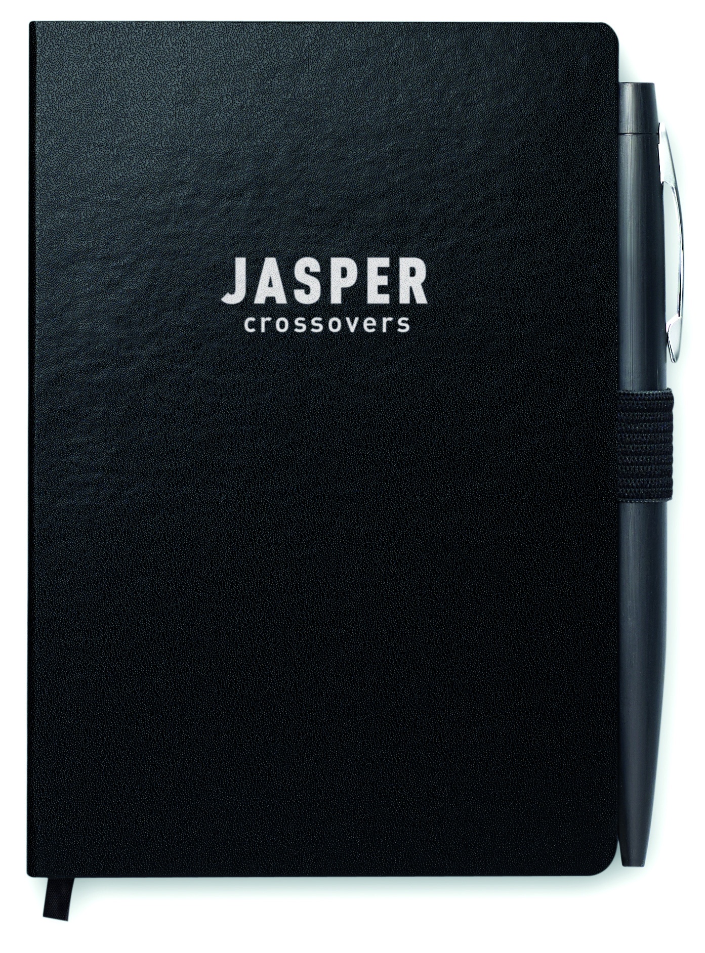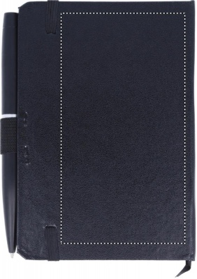 A6 notebook with pen. Hard PU cover. Casebound. 144 lined pages (72 sheets). Matching elastic closure strap, ribbon bookmark and pen holder. Matching metal push button ball pen. Blue ink.