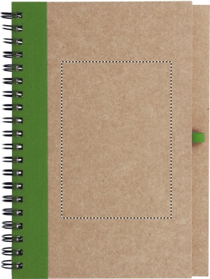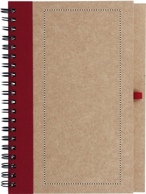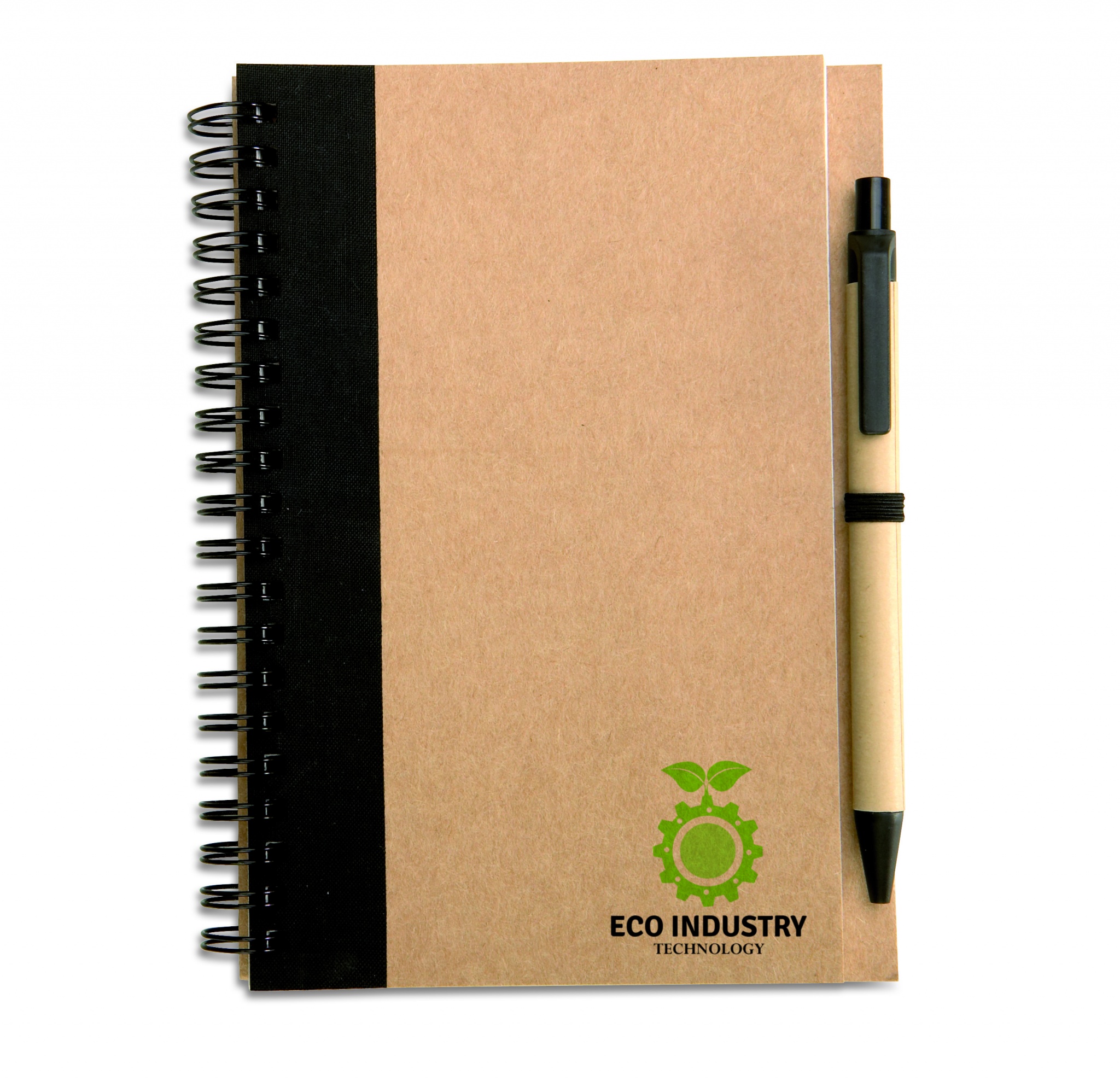 Recycled paper notebook with matching pen. Twin-wire. 140 plain recycled paper pages (70 sheets). Matching push button ball pen in recycled carton and biodegradable plastic. Blue ink. Matching elastic pen holder.