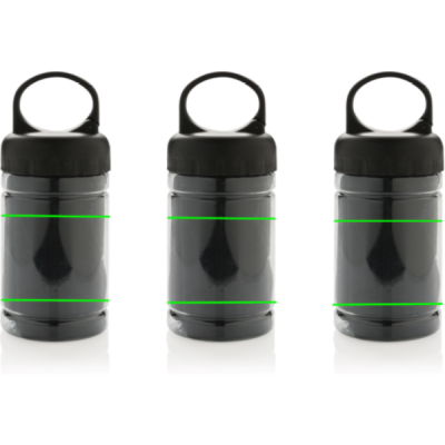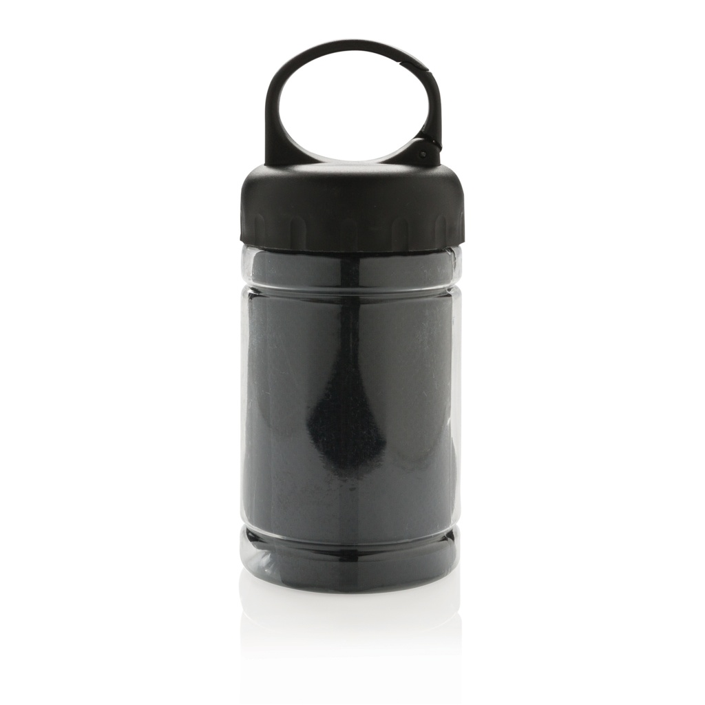Microfibre cooling towel 100% free of chemicals. 98% sun blocking function up to UV 50+ protection. The towel can be easily used by adding some cold water to the bottle creating a cool towel for fast refreshment. The bottle is made out of PP with ABS top and carabiner to take along on outdoor activities. 77 x 30cm.