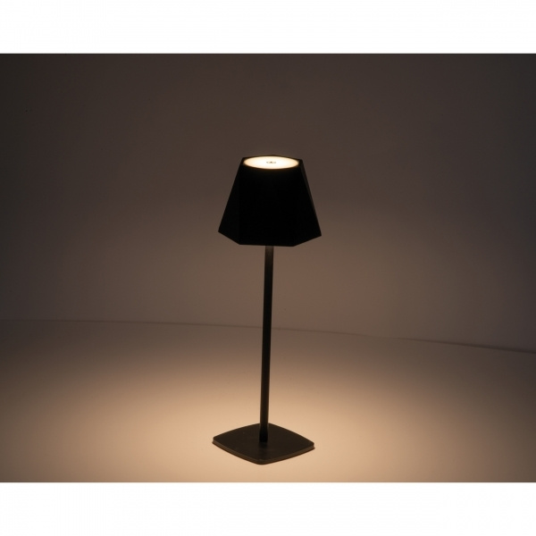 Table lamp with stainless steel base and plastic shade (PP). The lamp features a 1,800 mAh Li-ion battery (3.7V), 28 LEDs (130 lumens, 2.5W) that can be adjusted between 3000K (warm light) and 6000K (cool light) via a touch sensor with stepless dimming function. A one-meter USB-C charging cable is included. Burn time is approximately 5 hours when fully charged. Your logo is applied to the base using laser engraving. The lamp is delivered unassembled.