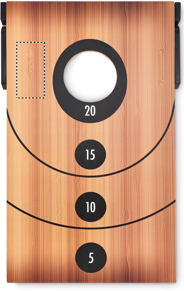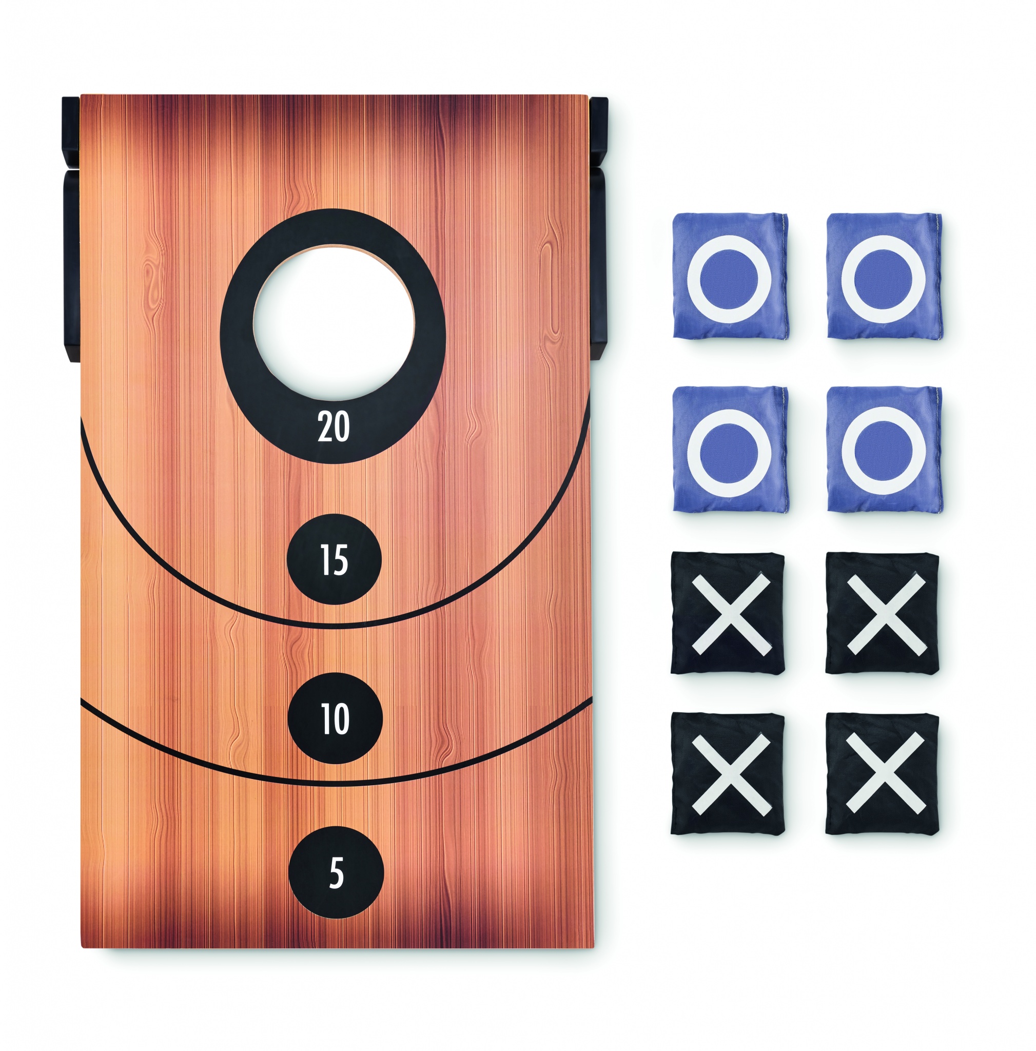Double sided sandbag throwing game and tic-tac-toe. Includes MDF board and 8 throw bags.