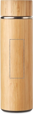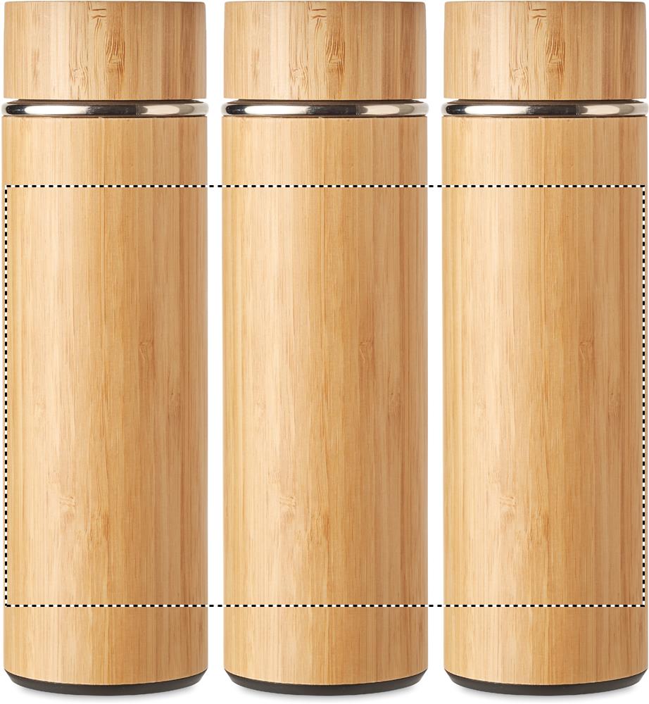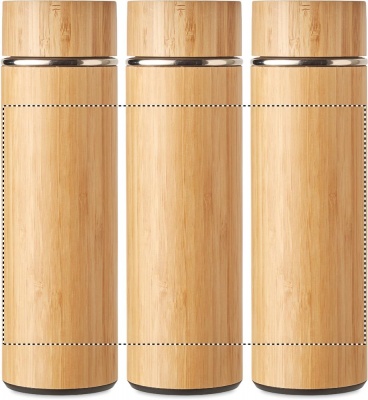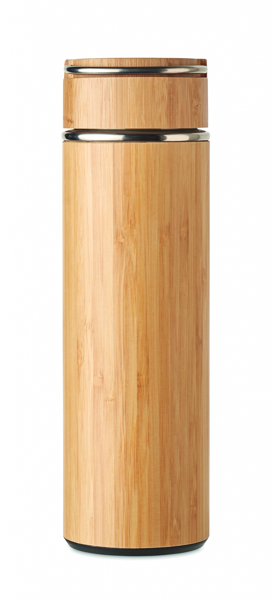 Double wall stainless steel/bamboo insulating vacuum flask with additional tea infuser inside. Capacity: 400 ml. Leak free. Bamboo is a natural product, there may be slight variations in colour and size per item, which can affect the final decoration outcome.