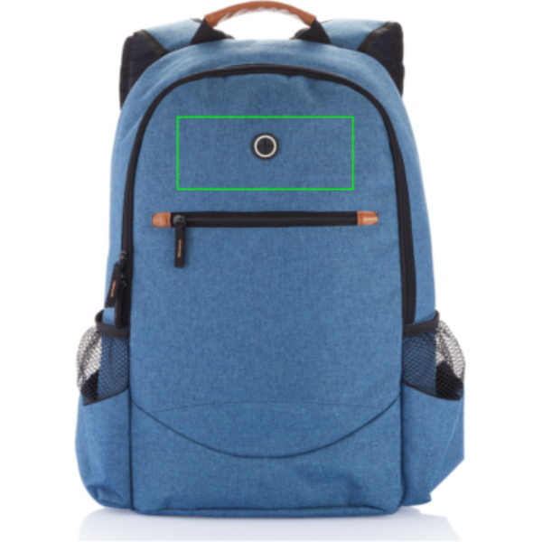 600D 2 tone polyester backpack with fashionable brown details on the handles and zippers.