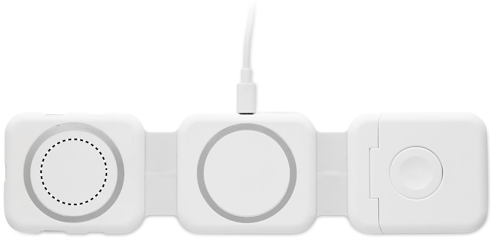 Magnetic charging station in ABS. 3 wireless charging spots. 1 x 15W, 1 x 5W for TWS and 1 Apple Watch charger (3W). 2 Type-C & 2 USB-A HUBS. Integrated cable input: connector from Type-C to USB-A.