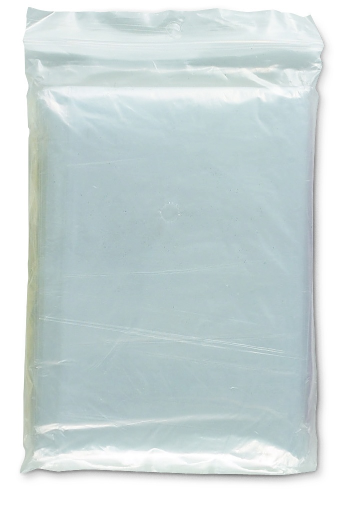 Foldable plastic poncho with attached hood, packed in a transparent polybag.