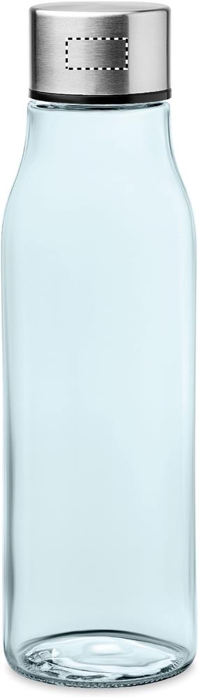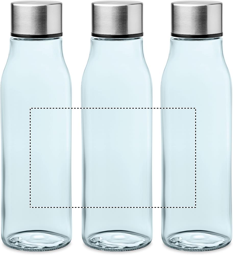 Glass drinking bottle with stainless steel lid. Capacity: 500 ml. Not suitable for carbonated drinks. Leak free.