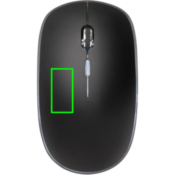Comfortable design and re-chargeable wireless mouse with option to engrave your logo that will light up for extra exposure your brand. The mouse has a re-chargeable 300 mah lithium poly battery that can be re-charged in three hours. Connection speed 125 HZ via the included and easy to install USB dongle. With left and right click button and middle scroll/click button. The sensitivity of the mouse can easily be adjusted to your personal preference. Compatible with all recent Windows and Mac operating systems