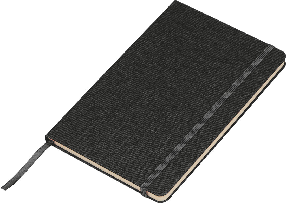Sustainable A5 notebook with a woven cover made of recycled PET and 160 pages of sugarcane paper. It also features a bookmark and an elastic closure band.
