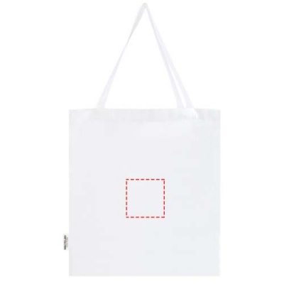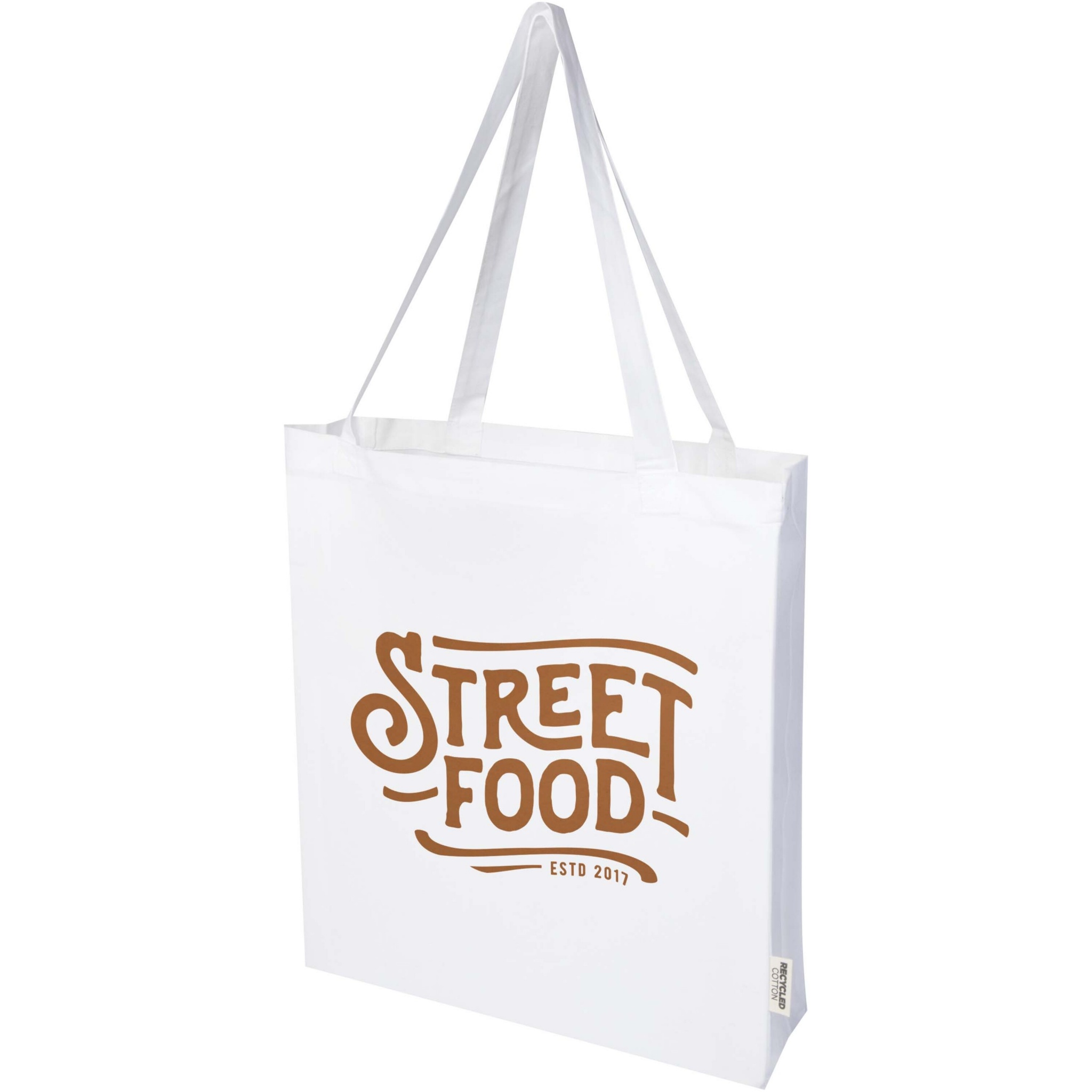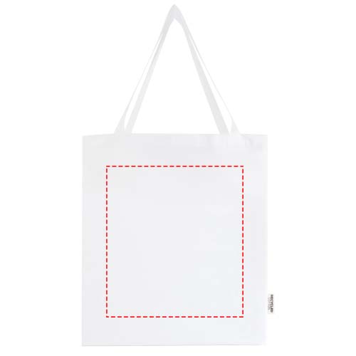 The Madras gusset tote bag made from 100% GRS certified recycled cotton is the perfect bag to give away during any event, conference or to use as a shopping bag for small groceries. The cotton density of 140 g/m² cotton makes the bag sturdy, long-lasting and suitable to carry heavy items in the main compartment. With the 30 cm long shoulder handles this tote bag is easy to carry around. The print methods available for this tote bag are also certified, making sure that the entire supply chain is transparent and certified. Made in India. Resistance up to 5kg weight.