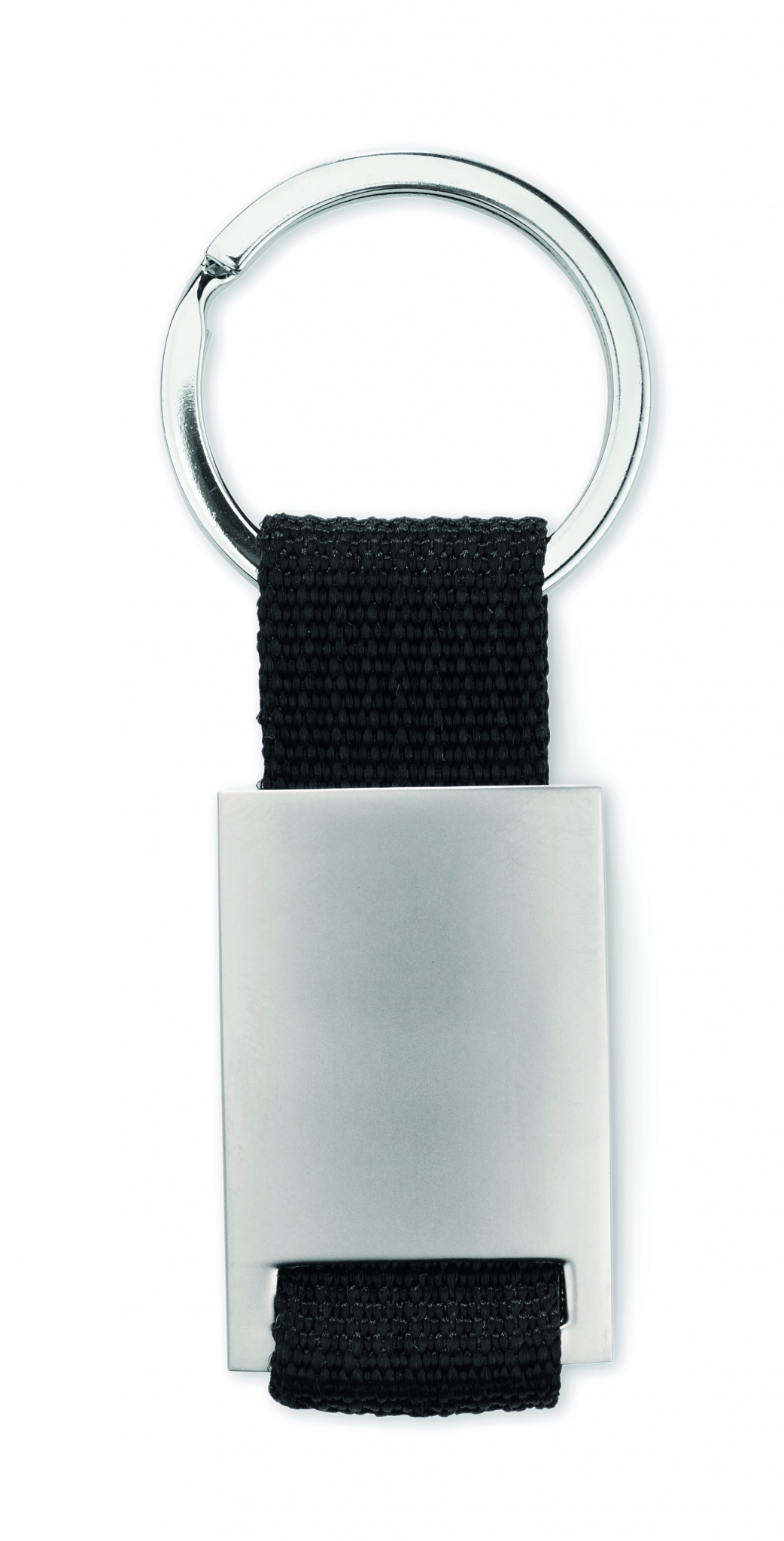 Metal rectangular key ring with coloured polyester webbing. Individually packed in a carton gift box.