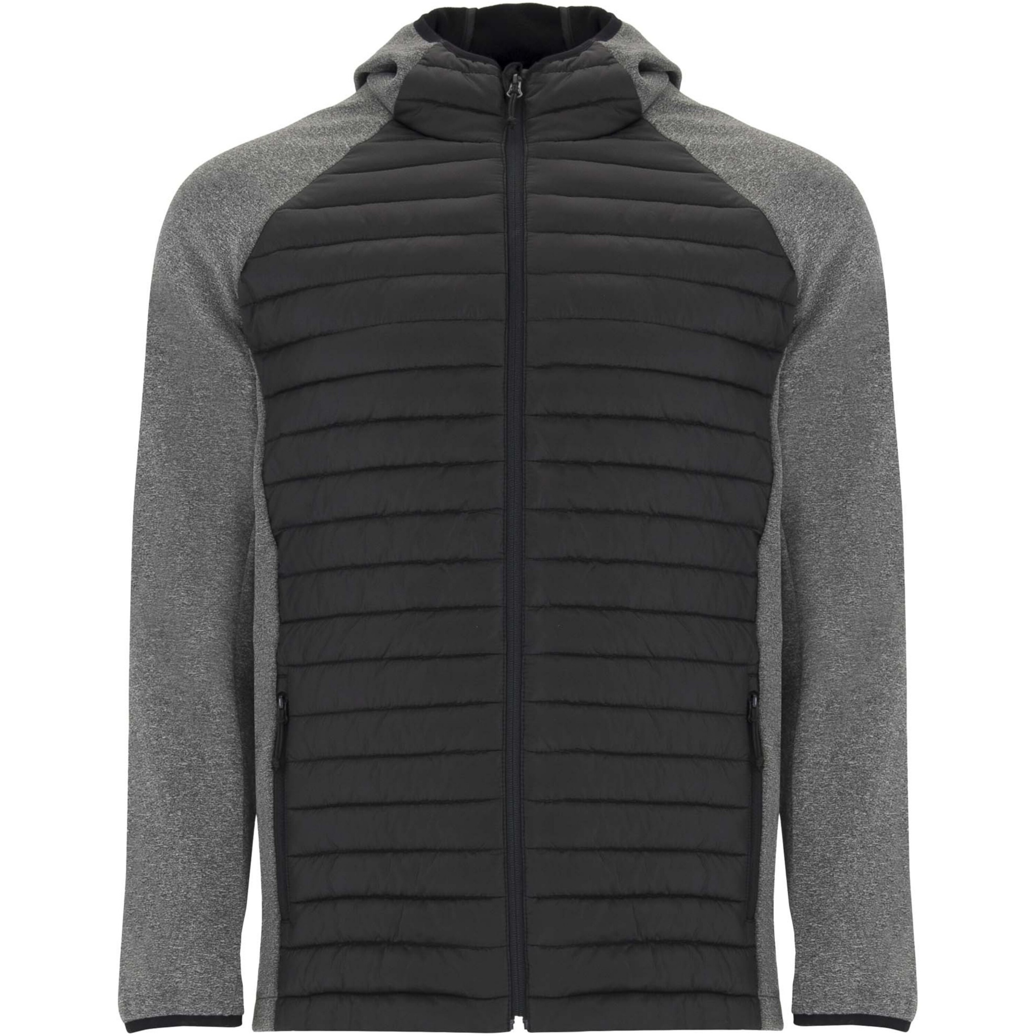 Unisex jacket in two-fabric combination: Fixed adjusted hood. Raglan sleeves. Sleeves, side panels and hood in softshell fabric. Quilted feather touch fabric in front and back. Inverted zip with matching chin protector and puller. Two front pockets with zippers. Matching elastic trim in collar, cuffs and hem. Removable label. Wind-proof model. The male model is 184 cm and is wearing size L, and the female model is 179 cm and is wearing size S.