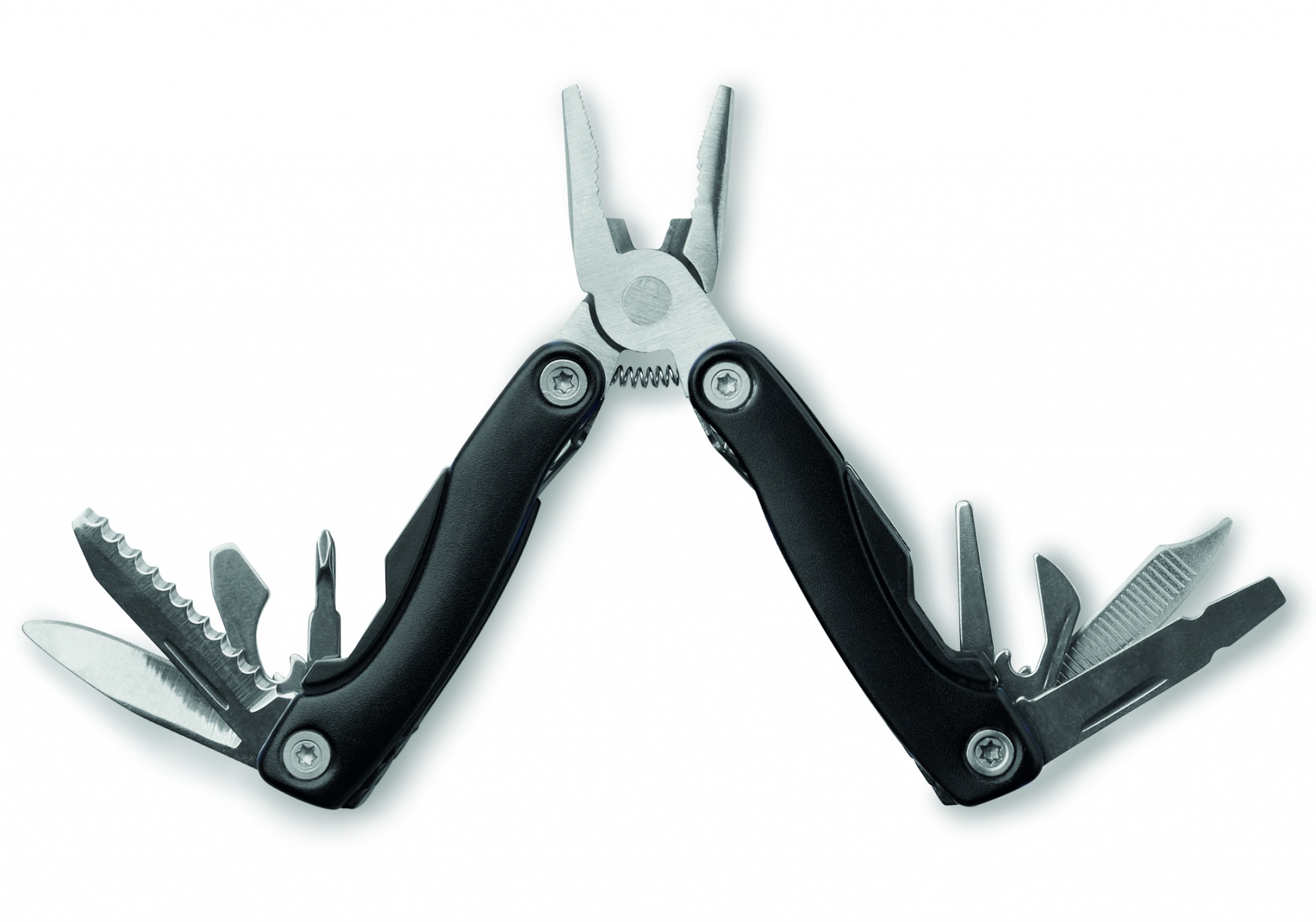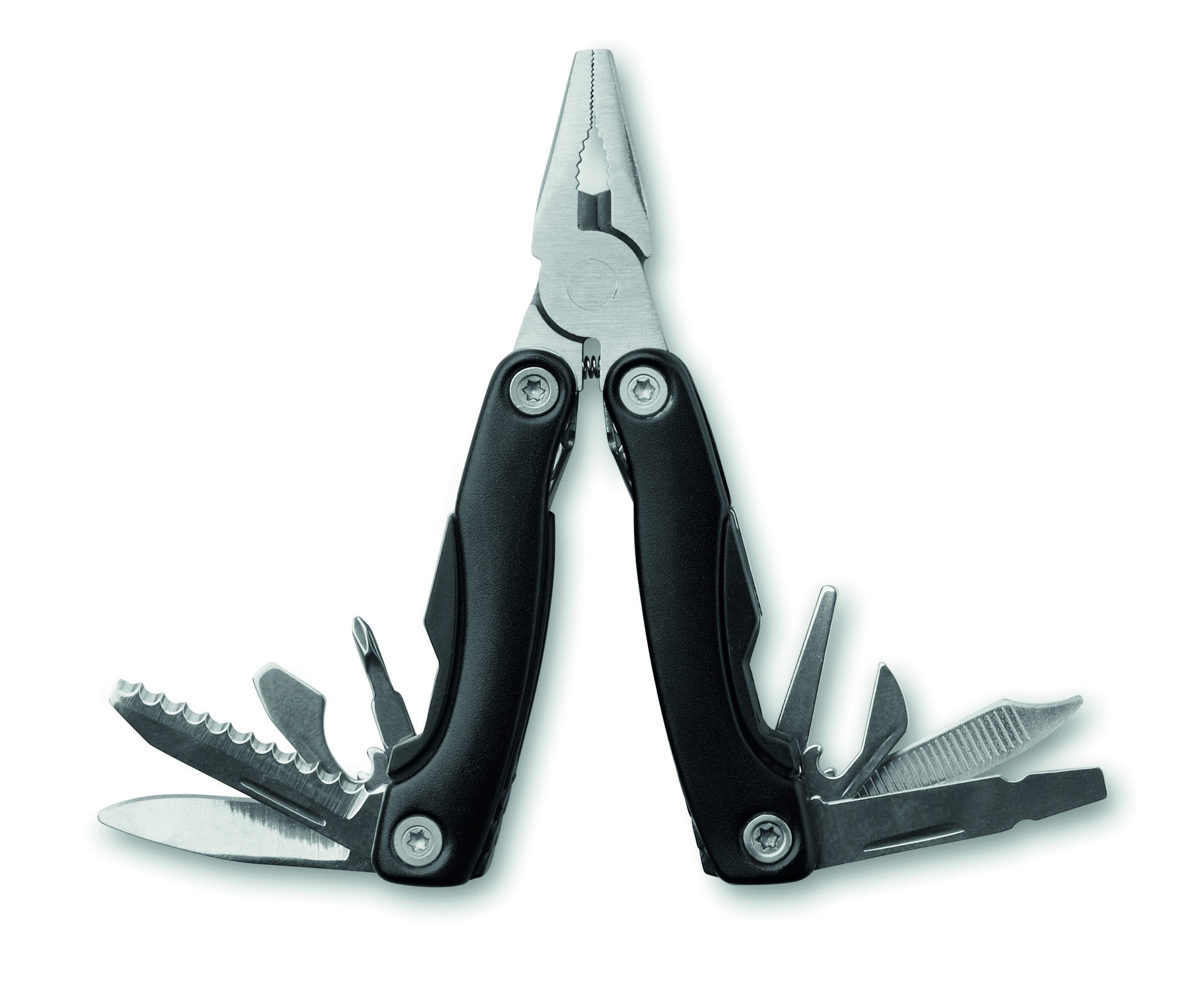 Foldable multi-tool in stainless steel with stainless steel pliers. 9 tool functions. 600D polyester pouch included.