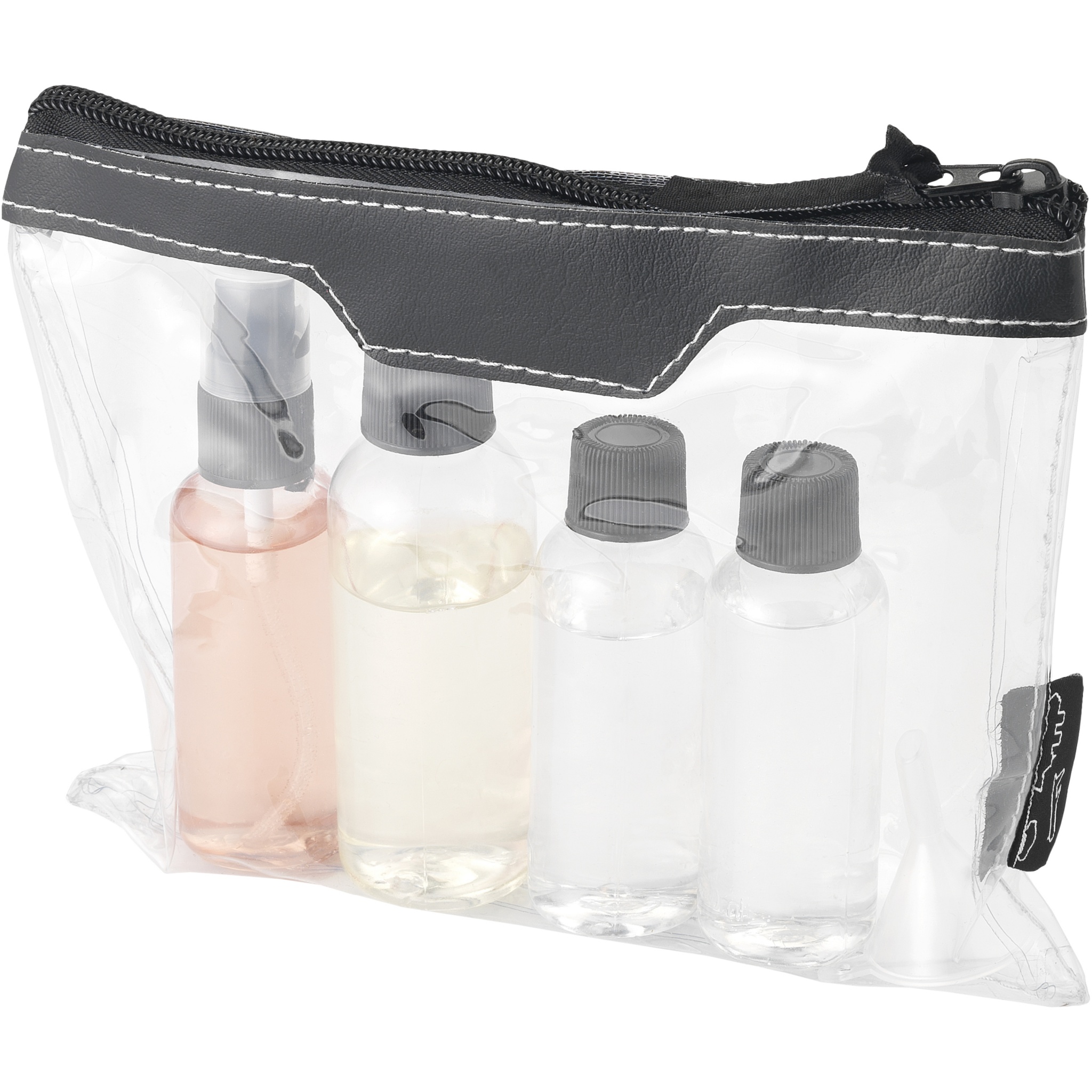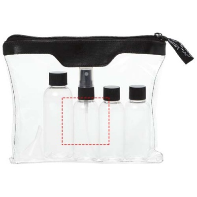 Airline approved toiletry bag which you can bring onboard. Including 2 x 50 ml bottle, 1 x 90 ml bottle and 1 x vaporizer and funnel. Bottles, vaporizer and funnel packed in polybag, comes separately from pouch. Decoration not available on components.