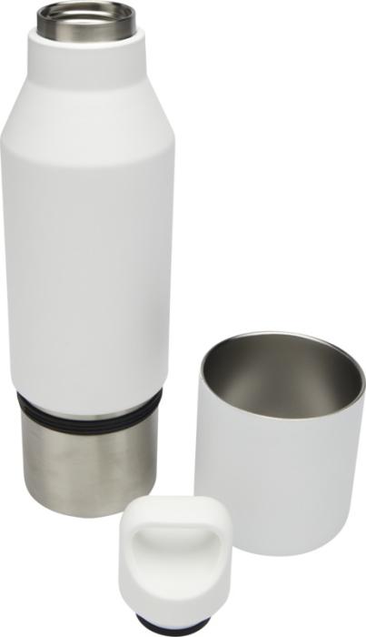 RCS certified stainless steel double wall copper insulated bottle with a removable cup. This multi-use bottle is designed to fit in the side pocket of a backpack, and has a convenient carrying handle that is integrated with the cap. Durable power coating on the outside. Keeps drinks hot for 12 hours or cold for 24 hours. Presented in a recycled cardboard gift box. Volume capacity bottle: 600 ml. Volume capacity cup: 300 ml.