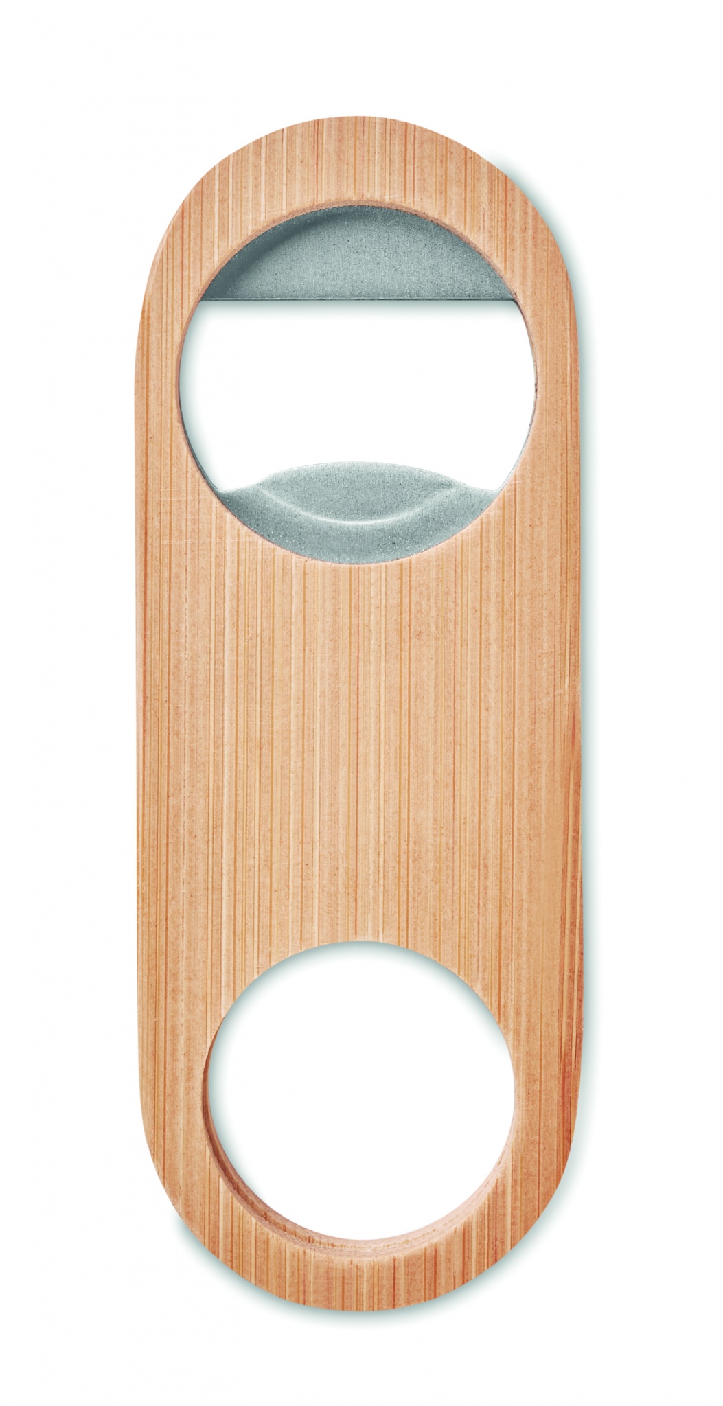 Stainless steel speed bottle opener with bamboo surface. Bamboo is a natural product, there may be slight variations in colour and size per item, which can affect the final decoration outcome.