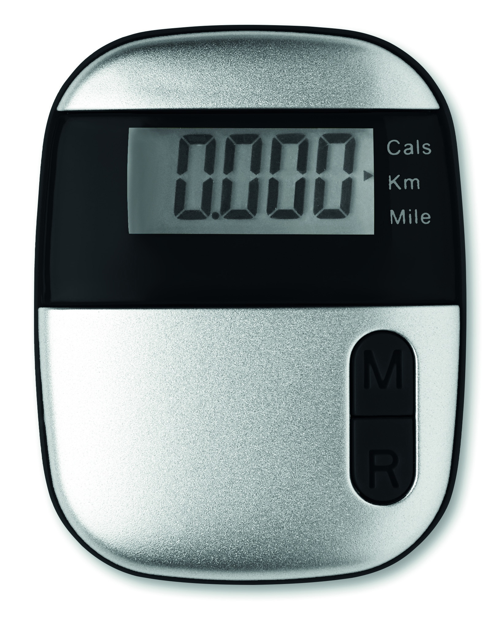 Pedometer with clip in ABS casing. With step, distance (miles and kilometres) and calorie counter, 1 cell battery included.