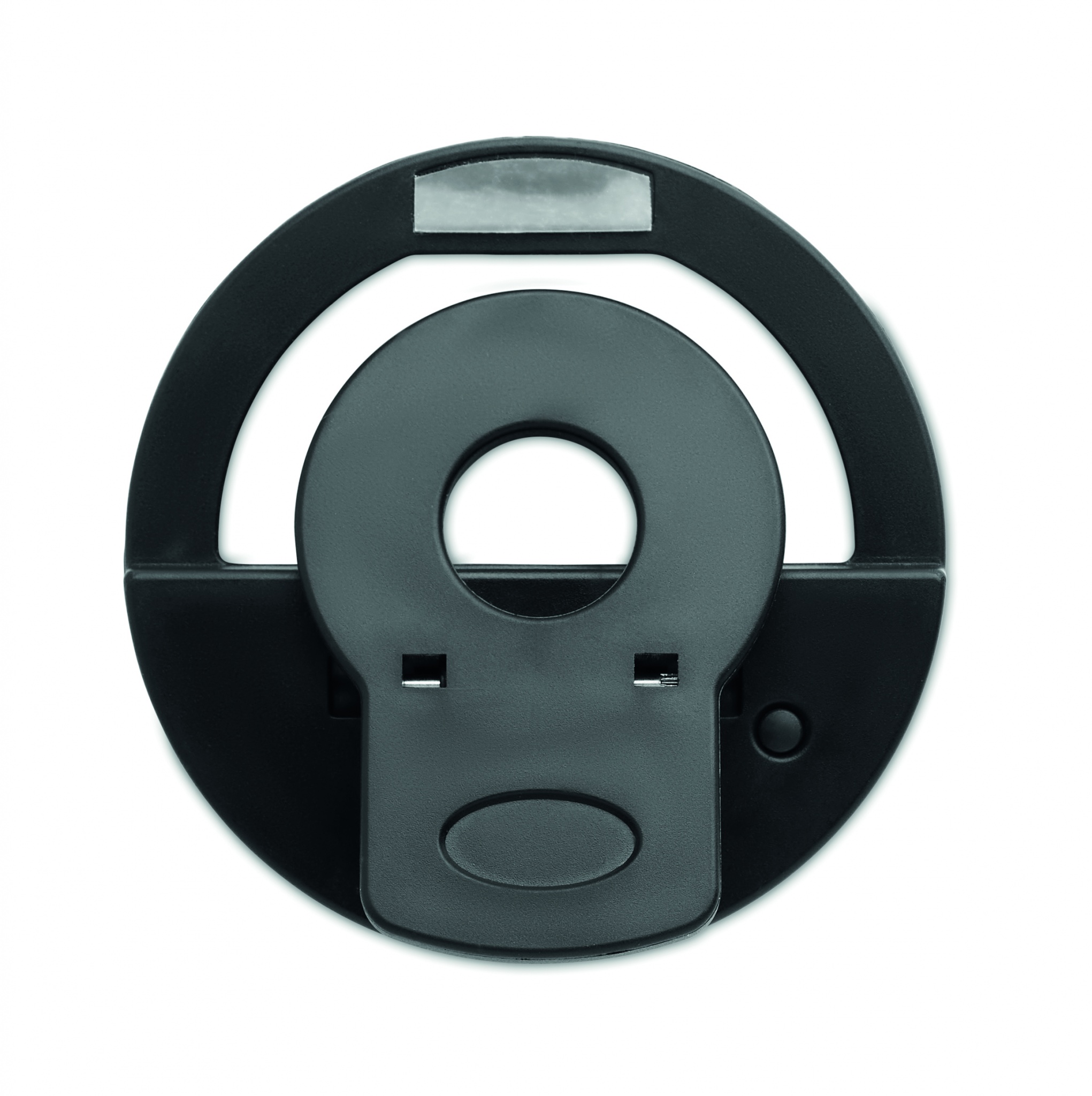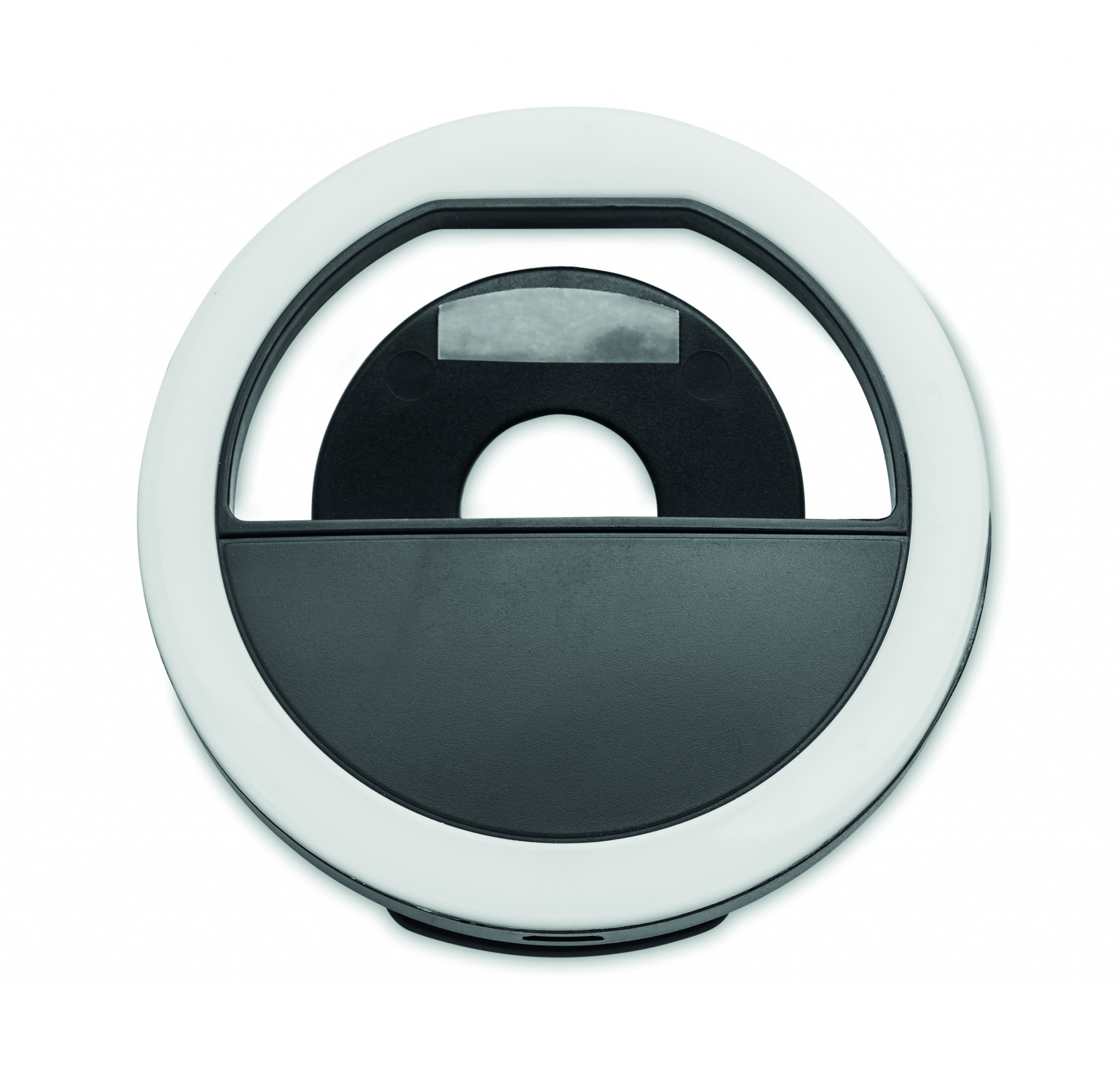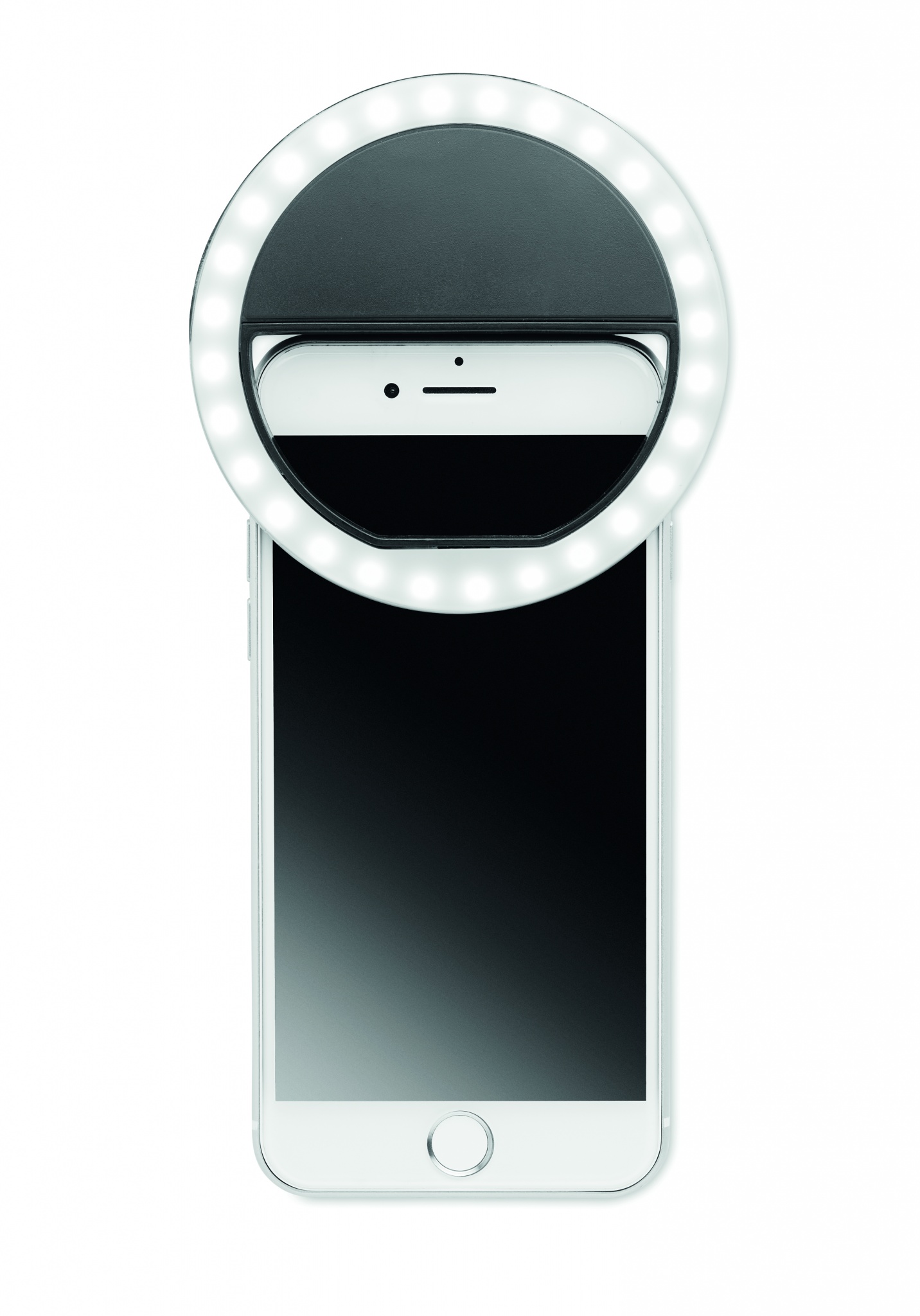 8 cm portable selfie ring light in ABS material with 28 LED's. White light adjustable to 3 different brightness levels. USB rechargeable 80 mAh battery.