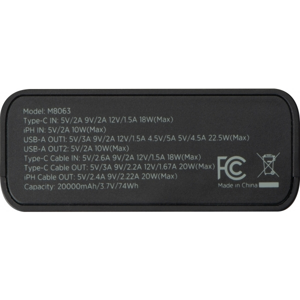 Power bank with fast charging function, capacity of 20 000 mAh. It has 2x USB port and 2x Type C port, built-in Type C and lightning cable and a digital display.