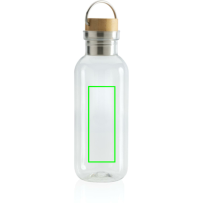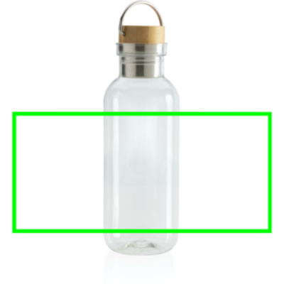 This RPET water bottle is single-wall constructed and features a stylish FSC-certified bamboo lid. It also features a handle for easy carrying. The body of the bottle is made from 100% RCS certified RPET. RCS certification ensures a completely certified supply chain of the recycled materials. Hand wash only. This product is for cold drinks only. Total recycled content: 56% based on total item weight. BPA free. Capacity 680ml. Including FSC®-certified kraft packaging.