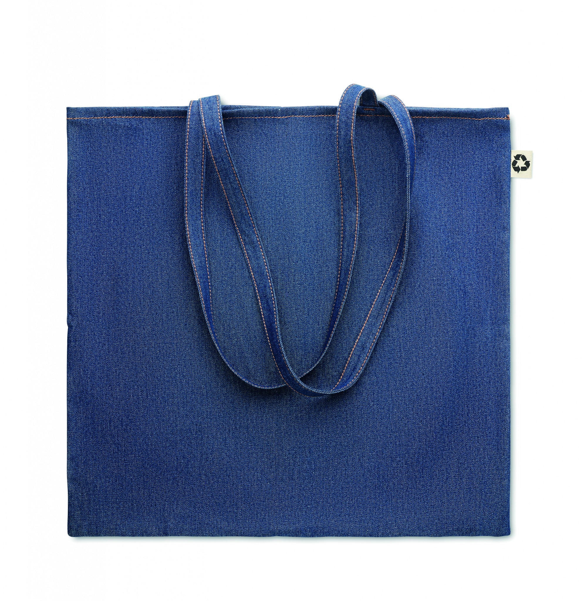 50% Recycled cotton dye denim and 50% cotton shopping bag with long handles. 250 gr/m².