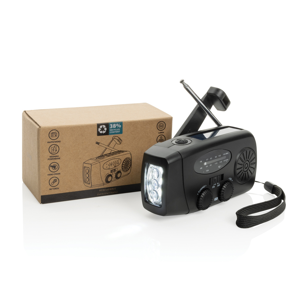 Stay prepared for any situation with RescueWave, a versatile emergency radio designed to keep you connected and powered. Featuring AM/FM radio, solar panel, an integrated 1W torch, USB output and USB C input, this compact device ensures you're equipped for unexpected moments. With a built-in 1800mAh battery, RescueWave can charge your phone, providing crucial power when you need it most. The hand crank mechanism offers dependable functionality—just 1 minute of cranking supports 5 minutes of radio or 30 minutes of torchlight, making it an essential tool for emergencies. When fully charged the radio will operate up to 15 hours of radio broadcast or 8 hours of torch light. Made out of RCS certified recycled materials, including recycled ABS plastic. RCS (Recycled Claim Standard) is a standard to verify the recycled content of a product throughout the whole supply chain. Total recycled content: 38% based on total item weight. Item and accessories are PVC-free and packed in FSC® packaging.
