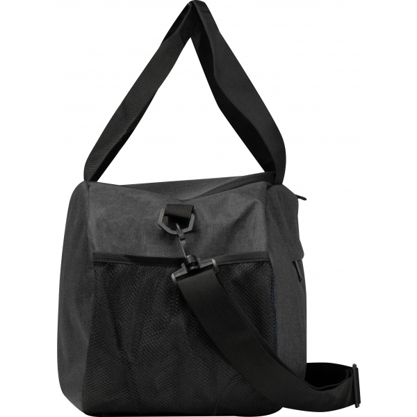 Bag made of recycled 300D polyester. The perfect companion whether for sports or travel. In addition to the spacious inner compartment, the bag has an adjustable and removable shoulder strap, two carrying handles, two mesh pockets on the outside and a zipper compartment on the outside. We will print your logo on the zipper compartment.