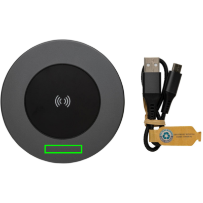 Aluminium 10W wireless fast charger made with RCS (Recycled Claim Standard) certified recycled aluminium, ABS and TPE. Total recycled content: 75% based on total item weight. RCS certification ensures a completely certified supply chain of the recycled materials. Aluminium does not lose its characteristics in the recycling process and can be recycled endlessly. Including 120 cm type C charging cable made from RCS certified recycled aluminium, TPE and PET. Packed in FSC® mix packaging. Input 9V/2A Output: 9V/1.1A.