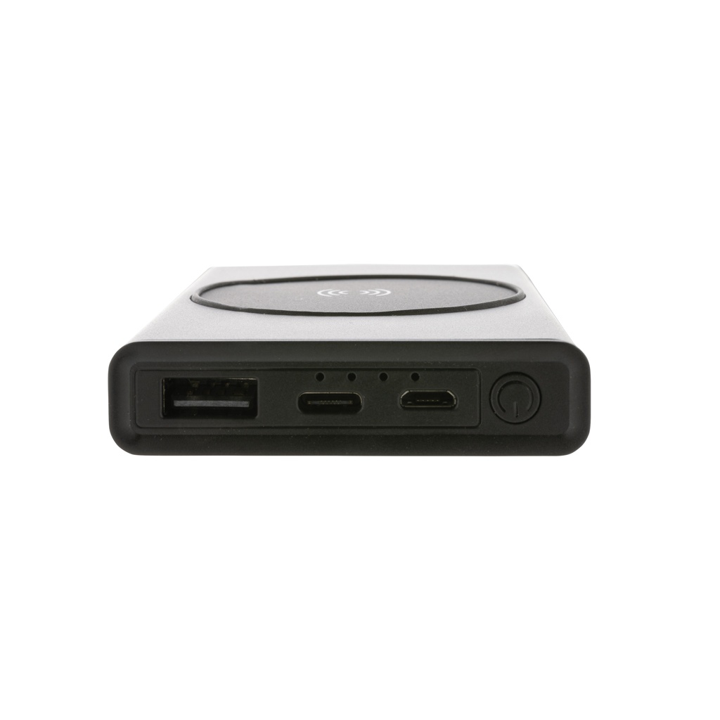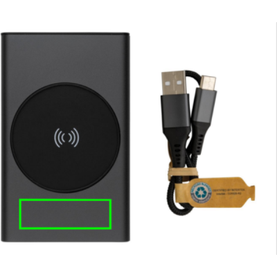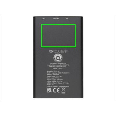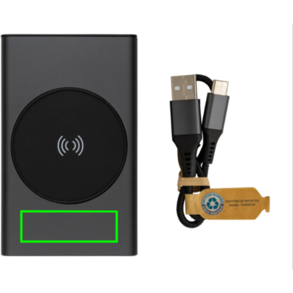 Powerbank made with RCS (Recycled Claim Standard) certified recycled aluminium and ABS. Total recycled content: 31 % based on total item weight. RCS certification ensures a completely certified supply chain of the recycled materials. Aluminium does not lose its characteristics in the recycling process and can be recycled endlessly. The powerbank contains a long-lasting grade A 5000 mAh lithium polymer battery. The wireless charger supports wireless charging up to 5W. The power indicators will indicate the remaining energy level so you always know when to re-charge. Item and accessories 100% PVC free. Including type C charging cable made from RCS certified recycled aluminium, TPE and PET. Packed in FSC® mix packaging. USB output 5/2.4A, Type C output: 5V/2.4A. Type C input: 2.4A. Micro USB input: 5V/2A.