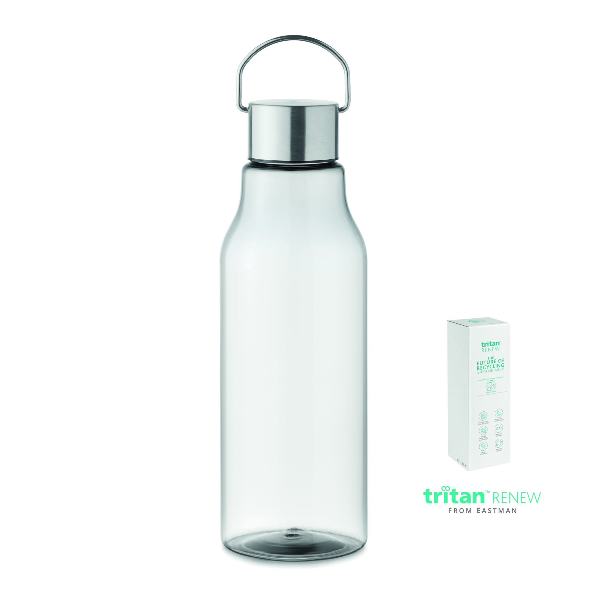 Drinking bottle in Tritan Renew™ which is BPA free with stainless steel handle lid. Leak-free. Capacity: 800 ml. This product is derived from 50% waste plastic using ISCC certified mass balance.