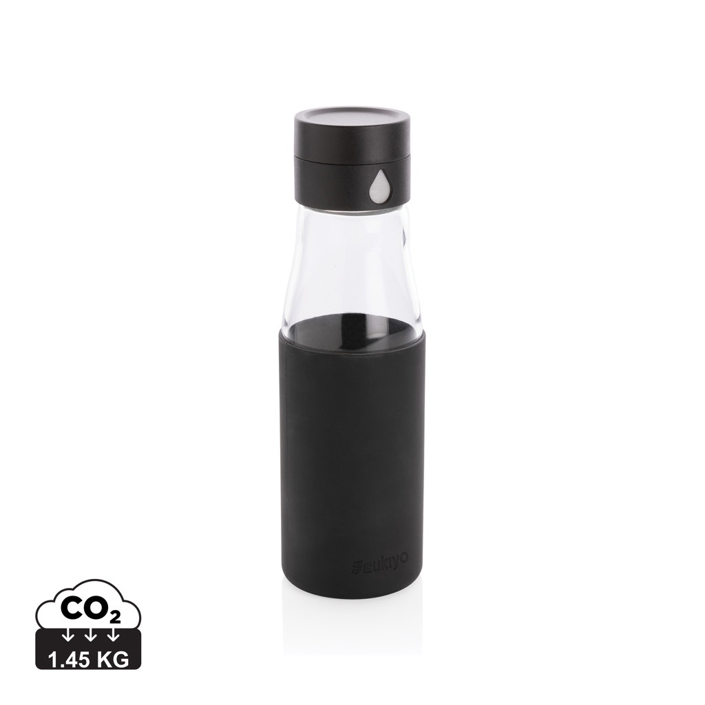 Ukiyo glass hydration tracking bottle with sleeve, black