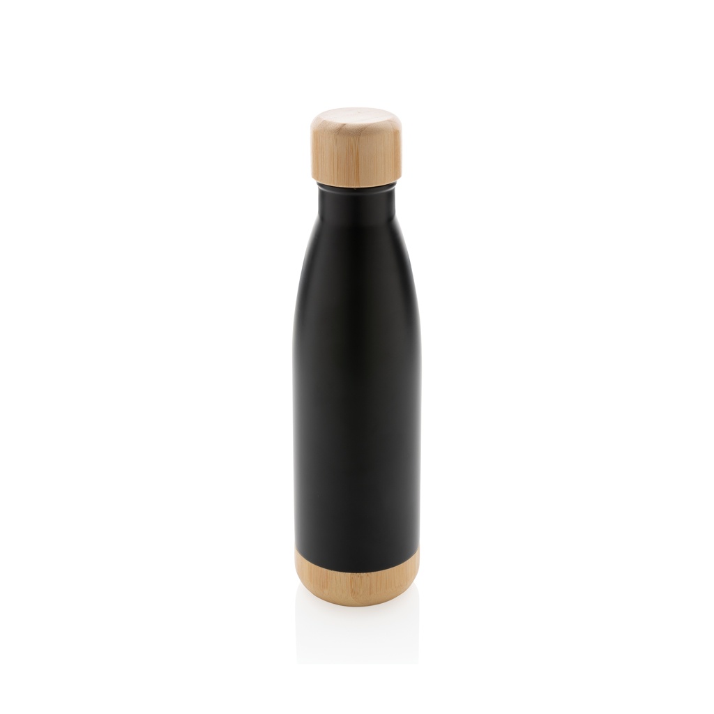 Vacuum stainless steel bottle with bamboo lid and bottom, black