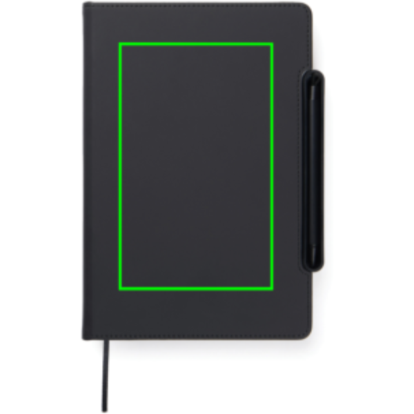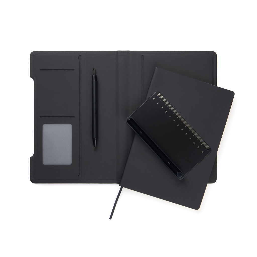 Meet the ultimate multifunctional notebook designed to support your daily workflow. This smart 4-in-1 solution combines practicality, flexibility and design in one. Crafted from RCS certified recycled paper with a cover in classic Baltimore matte PU coating making it as visually appealing as it is functional. A magnetic ruler serves as both a ruler and pen holder including a matching ballpoint pen with blue ink. The pen holder easy transforms into a phone stand integrated into the notebook’s structure. The interior features card holder flaps for convenient storage and an easily replaceable notebook insert for long-lasting use. The notebook contains 80 sheets / 160 lined pages, providing plenty of space for notes, planning, and ideas. It is the perfect companion for meetings, travel, or everyday organisation. Total recycled content: 70% based on total item weight. Certified by Control Union, CU1162221.