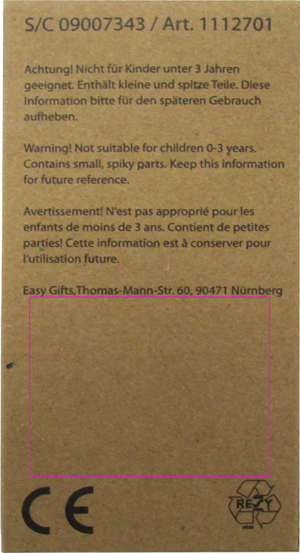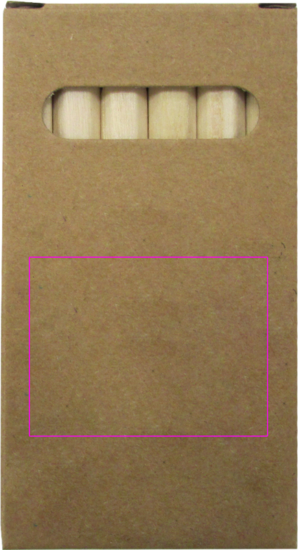 6 short crayons in a cardboard case. We will pad print your logo on top of the cardboard in your desired color.