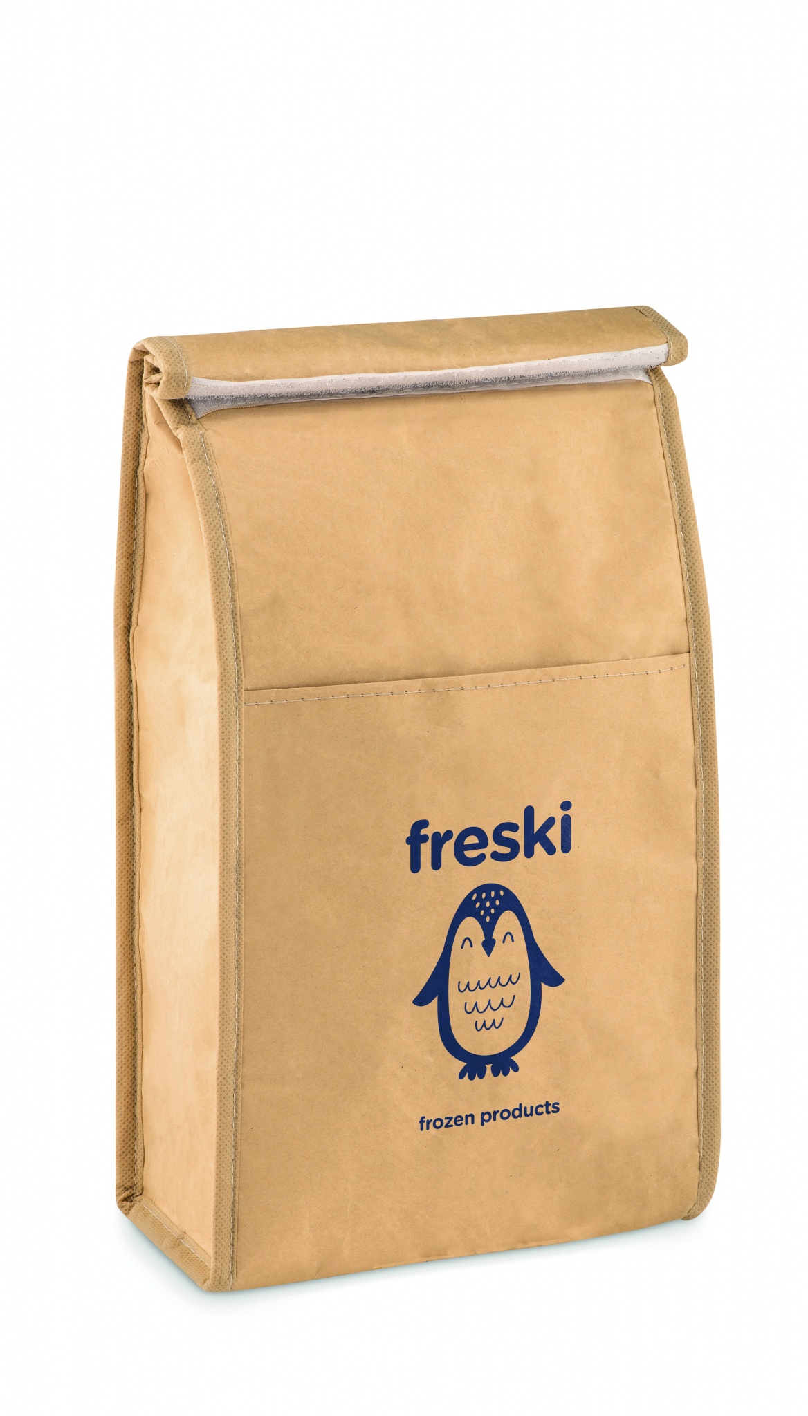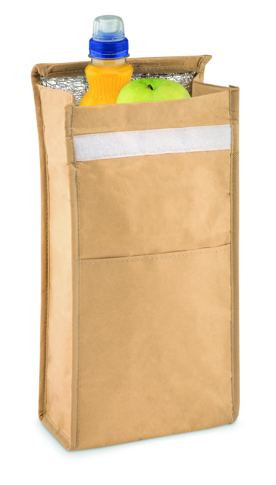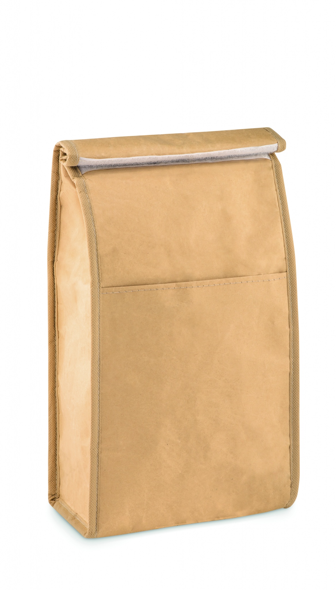 Woven paper woven cooler lunch bag with front pocket. Isolation material: PE foam layer. Capacity 3L.