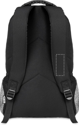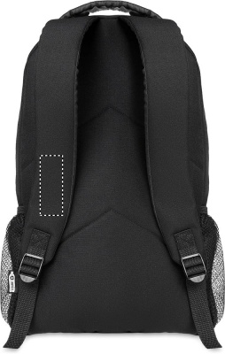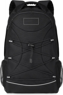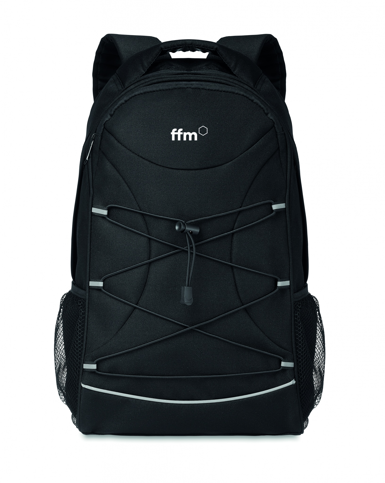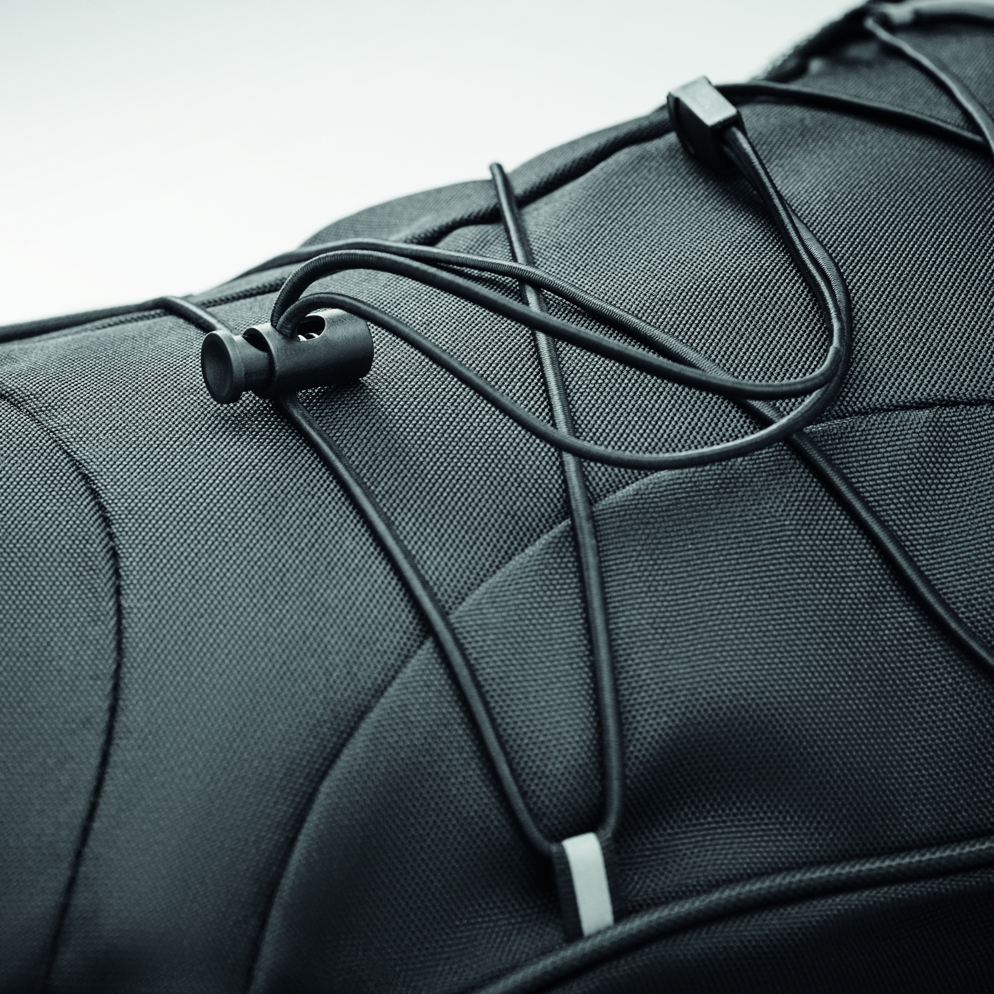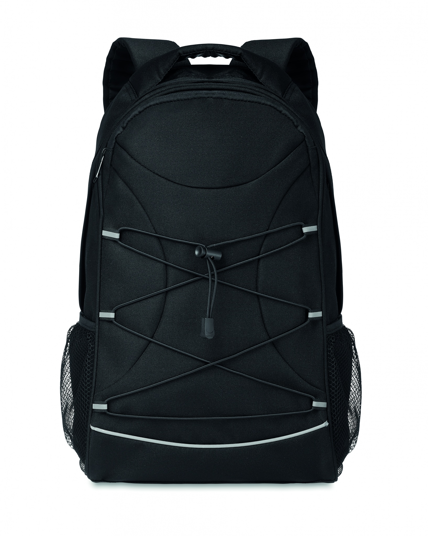 600D RPET seljakott, tumedate nööridega ees ja peegeldava esipaneeli funktsiooniga. Võrktaskud mõlemal küljel.