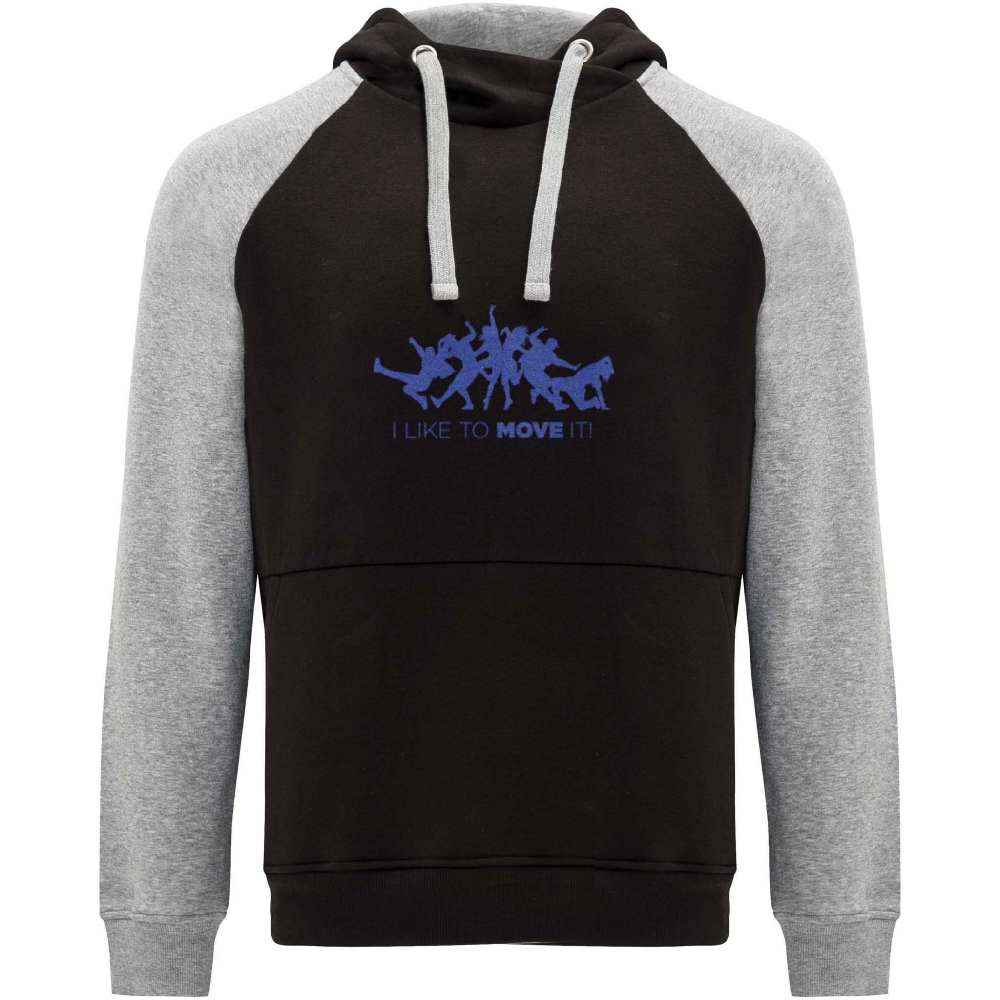 Kahevärviline unisex kapuuts. Ristkaeluse ja metallaasadega kapuuts. Kontrastne sisemine kapuuts, nöör ja raglaanvarrukad. Känguru tasku. Kätised ja alläär 1x1 elastaanist soonikust. Eemaldatav etikett.