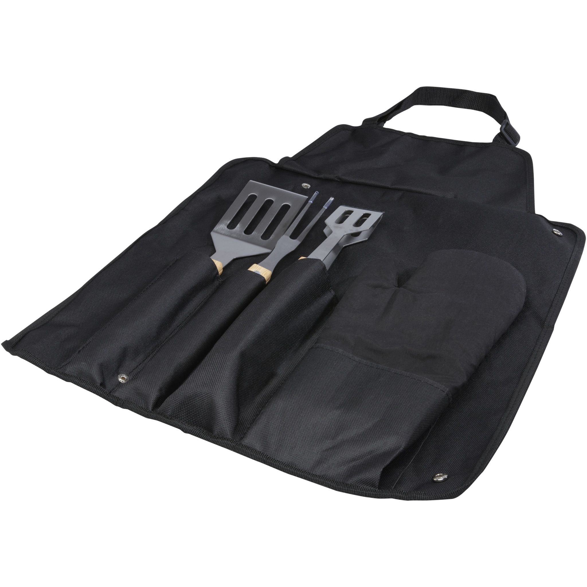 5-osaline grillikomplekt labida (36,5 x 7 cm), kahvli (36,5 x 2 cm), tangi (36,5 x 5 cm), kinnas (25 x 16 cm) ja põllega koos kotiga (42 x 60 cm) . Käepidemed on valmistatud bambusest, mis on hangitud ja toodetud säästvaid standardeid järgides.