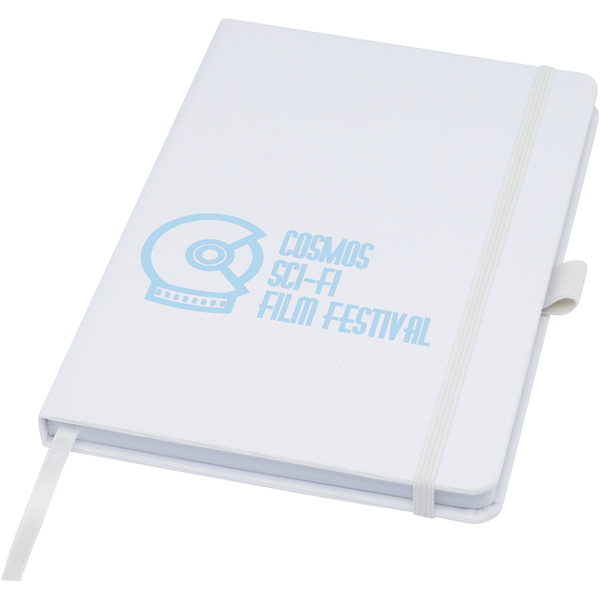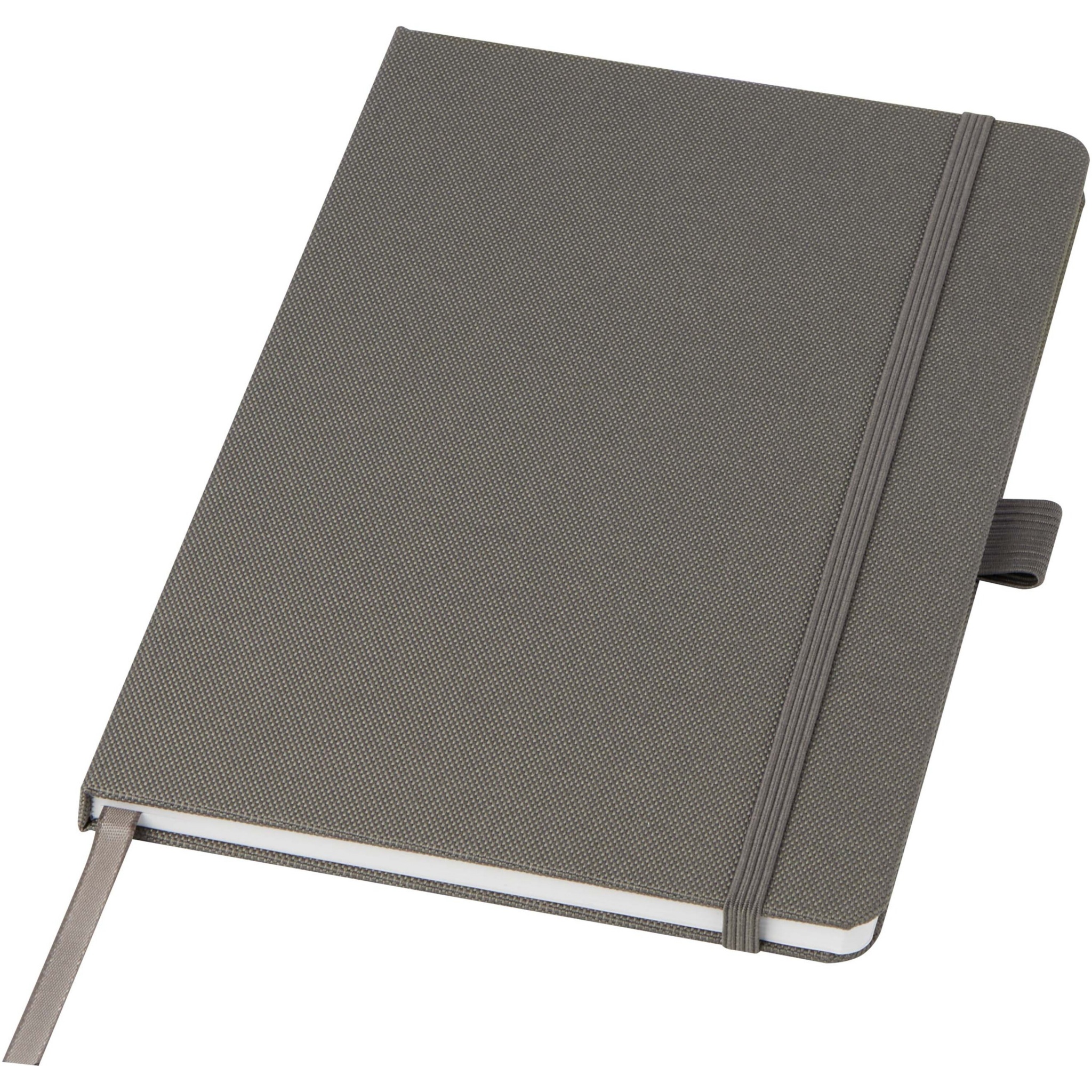 RPET kangast kaanega A5 märkmik. Sisaldab 80 lehte 70 g/m2 vooderdatud küljenduse, pliiatsisilmuse ja lindimarkeriga taaskasutatud paberit. Saab kombineerida 107757 Honua RPET pastapliiatsiga.