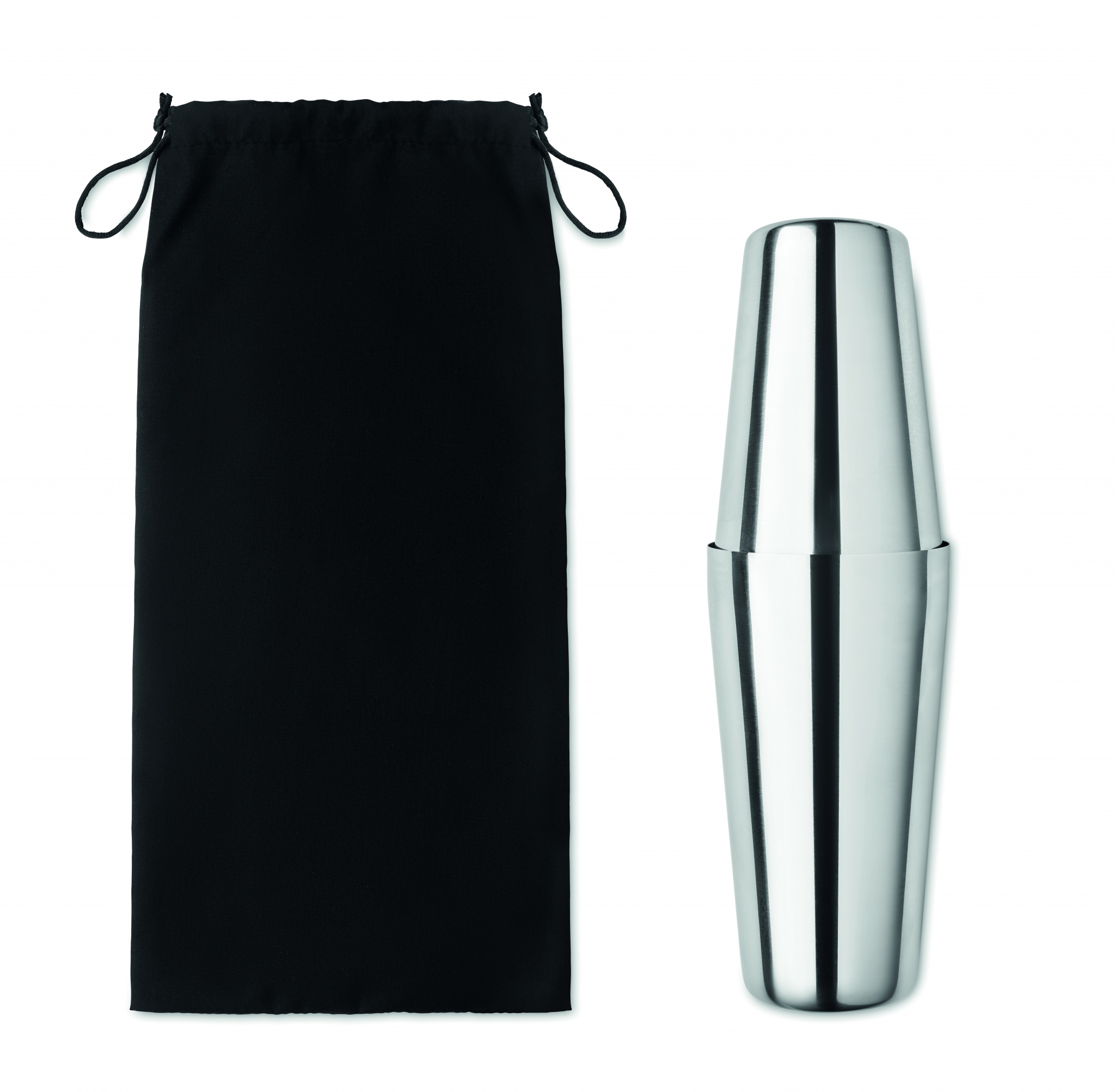 Roostevabast terasest kokteilikomplekt 750 ml šeikeri, mõõtekanni (30 ml) ja sõelaga puuvillases kotis.