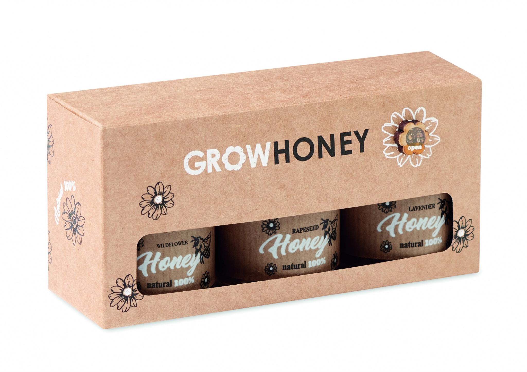 Valikus 3 naturaalset meepurki, millel on puidust meekangas. Metslille-, lavendli- ja rapsimesi (igaüks 50g). Tuleb jõupaberikarbis. Sealhulgas mesilase lilleseemned. Valmistatud EL-is. Ühendkuningriigis ei ole müügil.